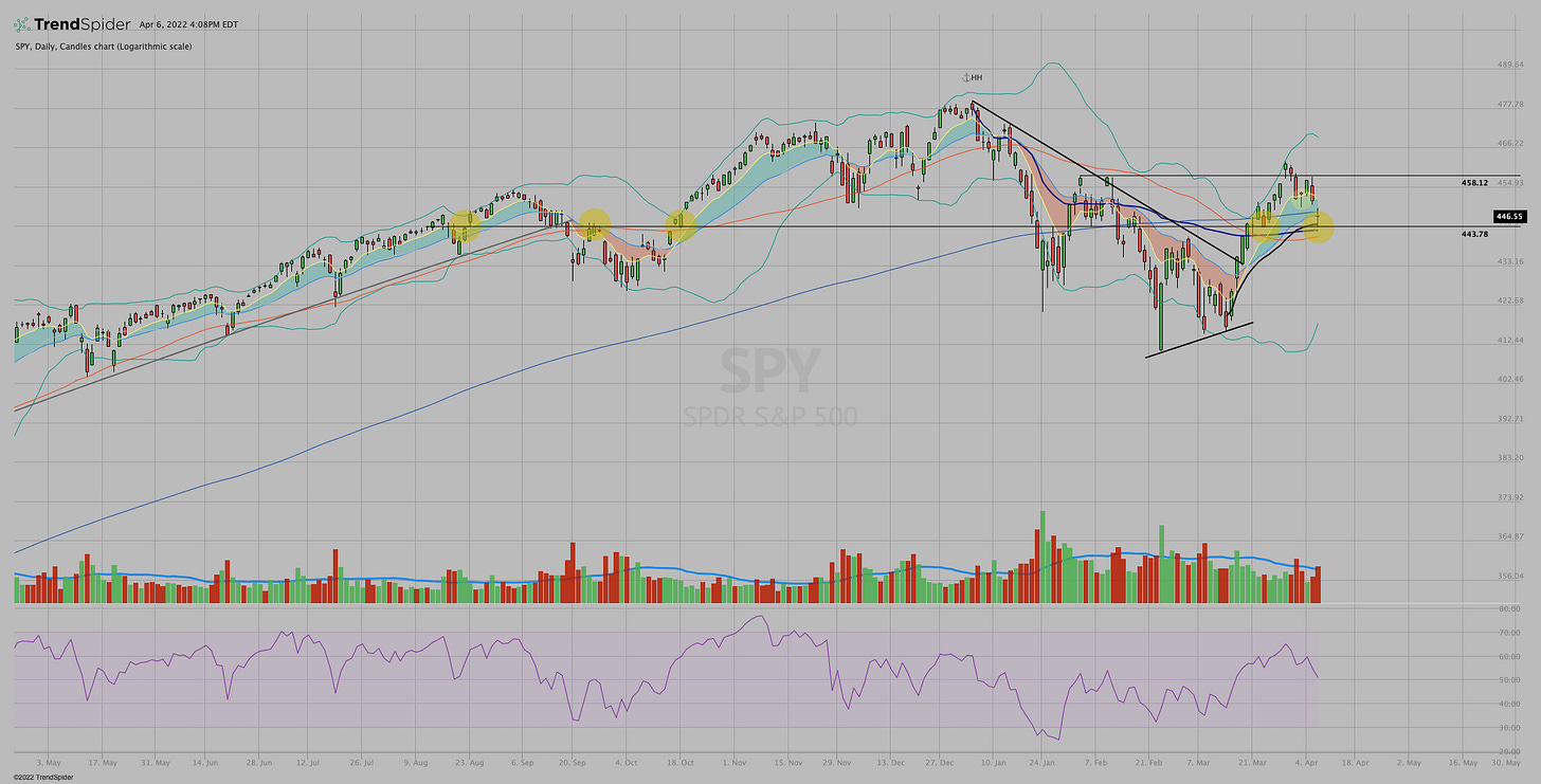 $SPY has support below in the 441–443 price range. 443 is an area that dates back to August of 2021. That price held today and buying came in to stop the slide. The VWAP anchored to the low of March 14, 2022, and the 50-day moving average are also in the area. Who knows if it will help. These are reference points of which to be mindful.