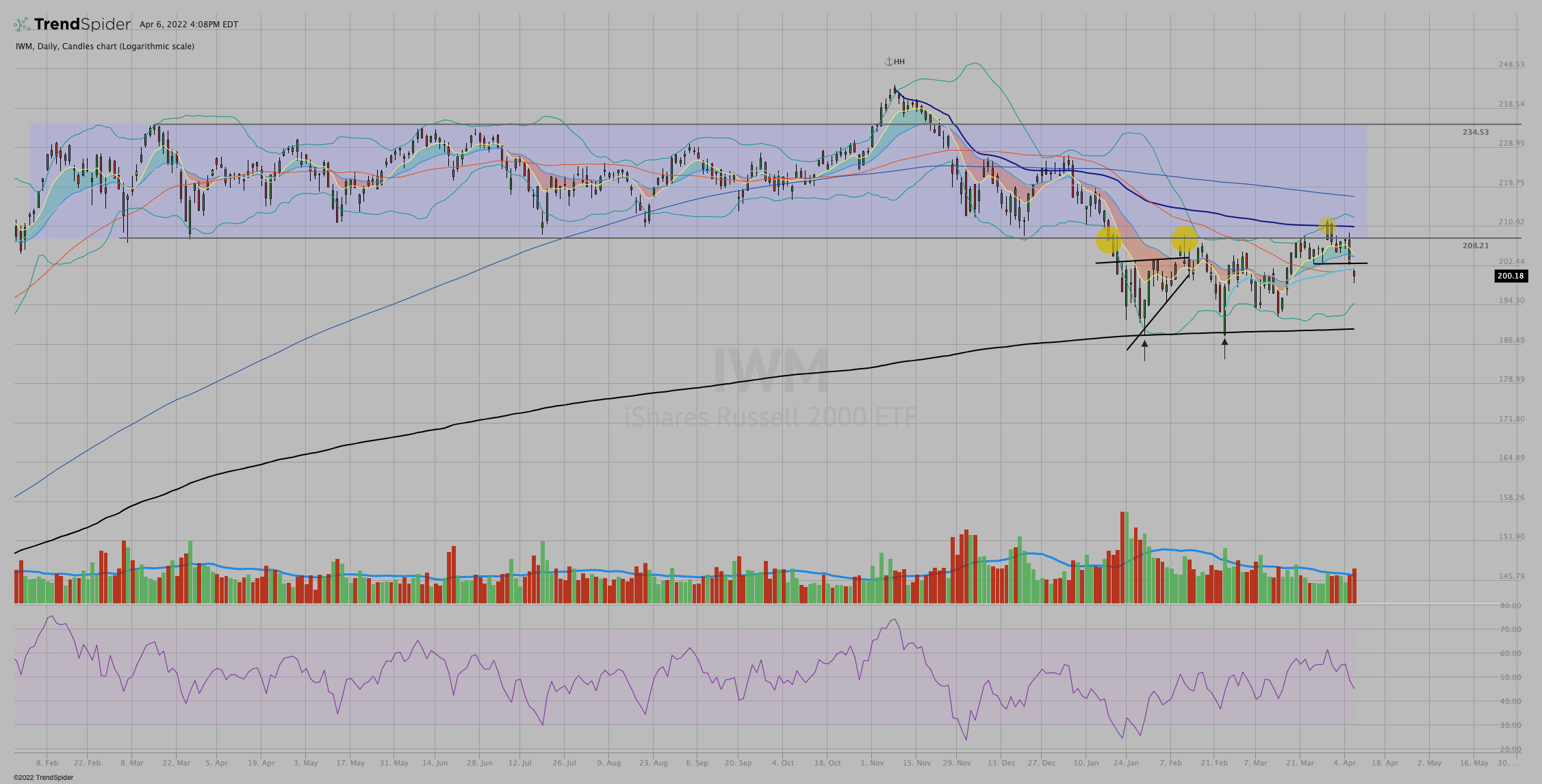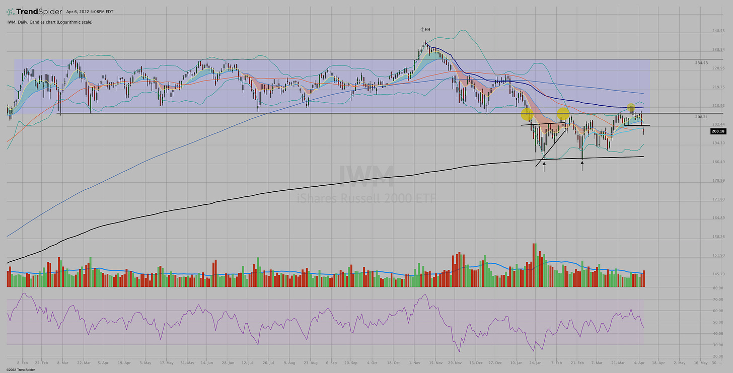 $IWM is a little more concerning as there has been failed move back into the sideways range of 14 months now and a solid rejection at the VWAP anchored to all-time-highs of November 8, 2021.