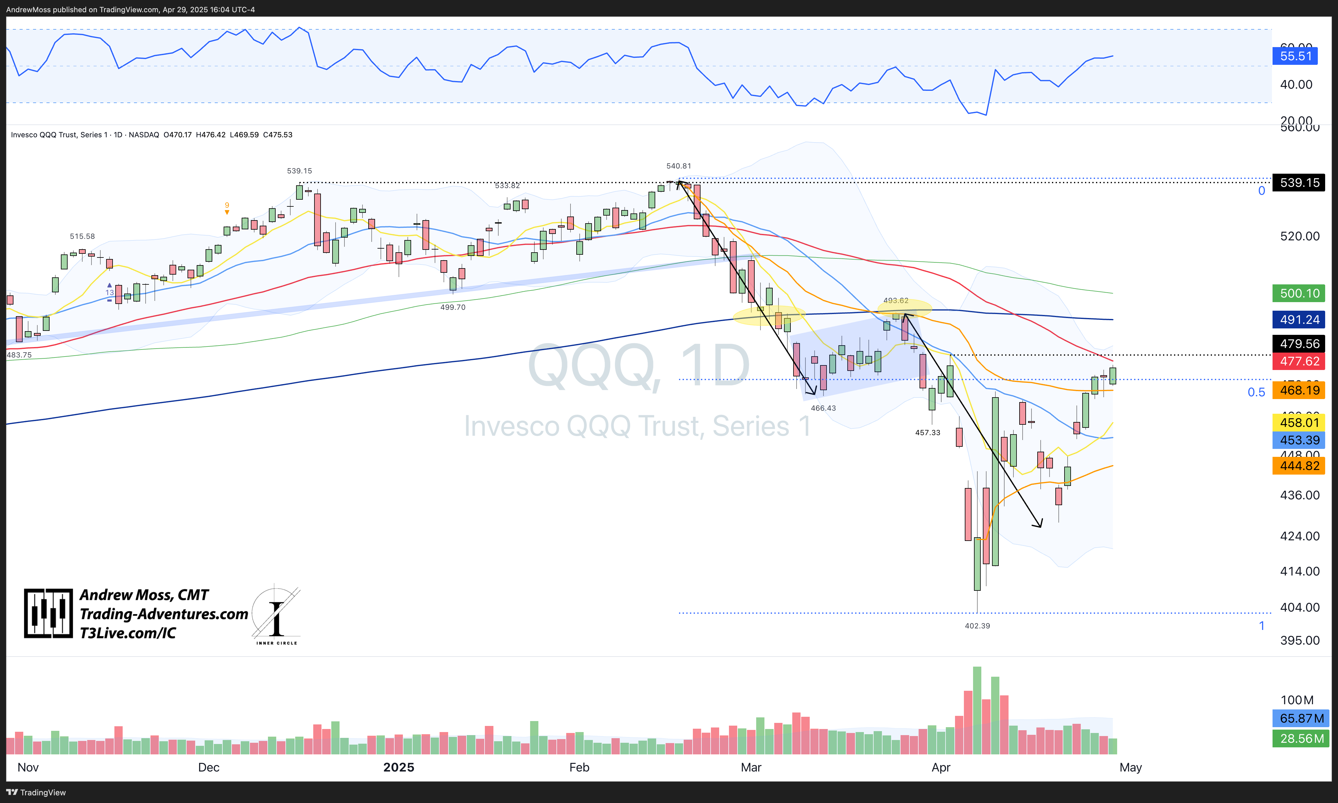 QQQ is out of its ‘pinch’ area, and also above the 50% selloff retracement level. But it has a pivot high and the 50-day MA as potential resistance overhead, ~$477.60 - $479.56.
