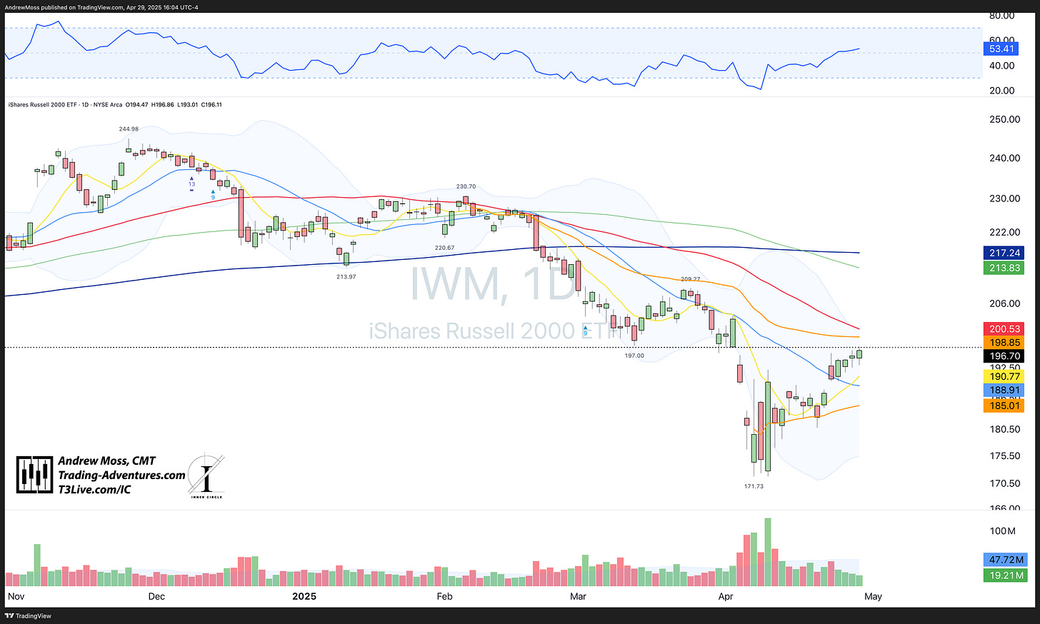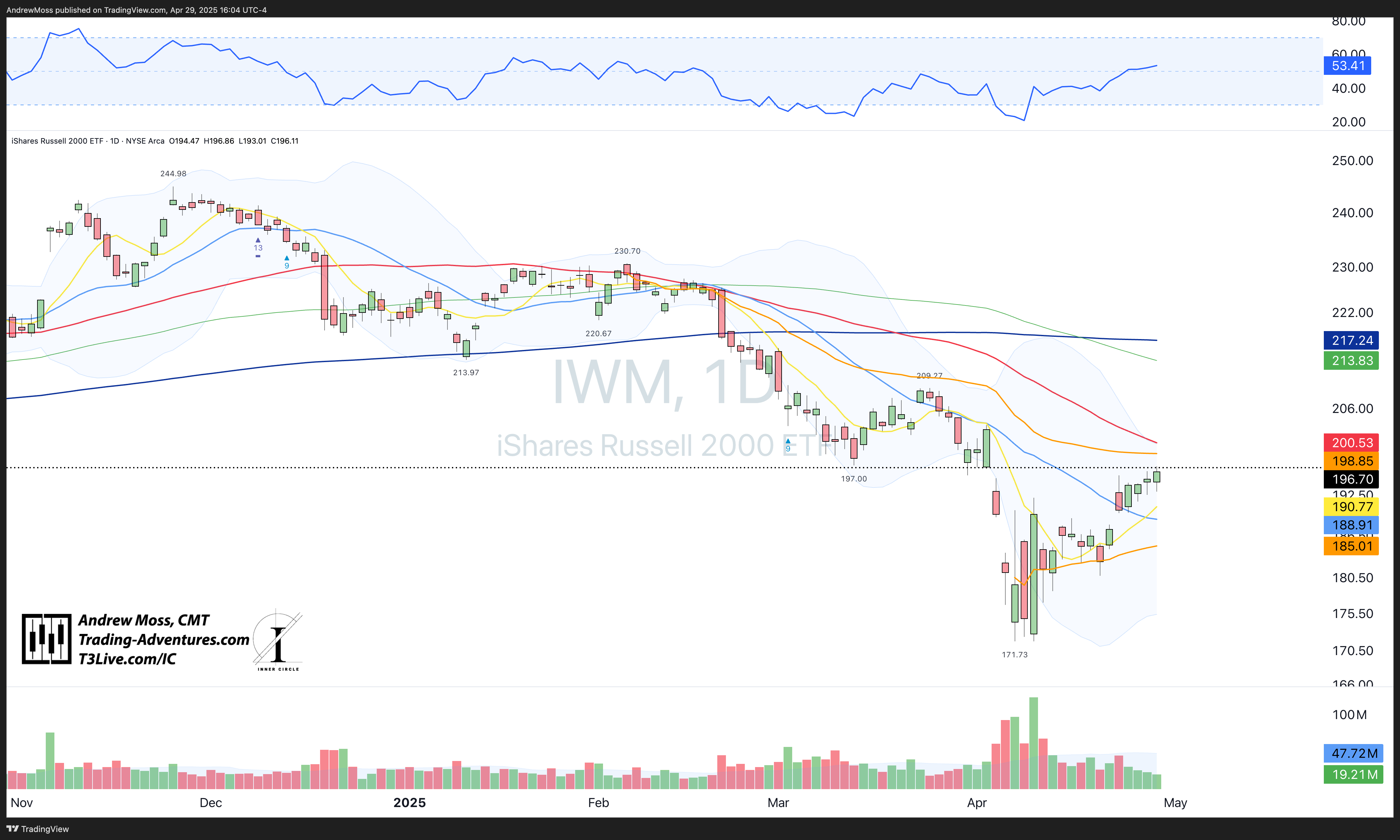 IWM has been drifting higher and into the $196.70 pivot for the last five trading days. That pivot is one layer of potential resistance, followed by a pivot high AVWAP near $199 and the 50-day MA at $200.53.