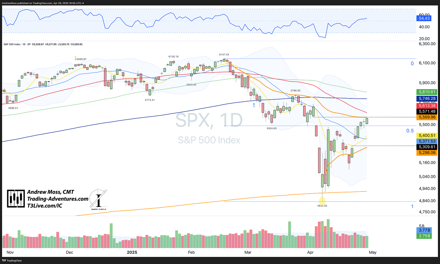 SPX is testing the upper boundary of ‘the Pinch’ zone at ~5570. There is also a gap pivot at 5571, adding to potential resistance. The RSI is back over the halfway mark, and price has recovered more than 50% of the 2/19 - 4/7 selloff.