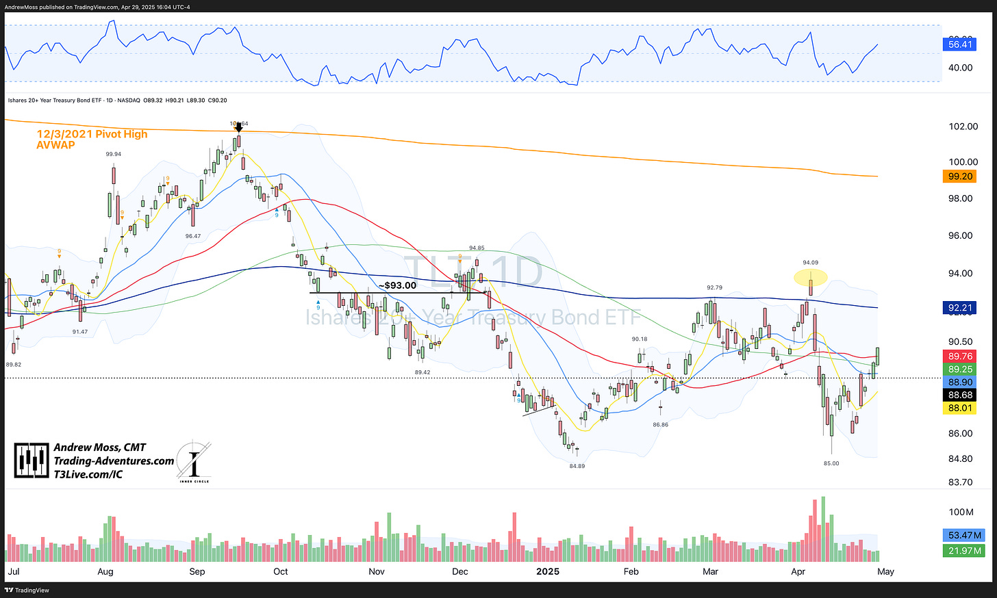 TLT has joined stocks in the substantial recovery and is back over all of its key moving averages, except the 200-day, up around $92.