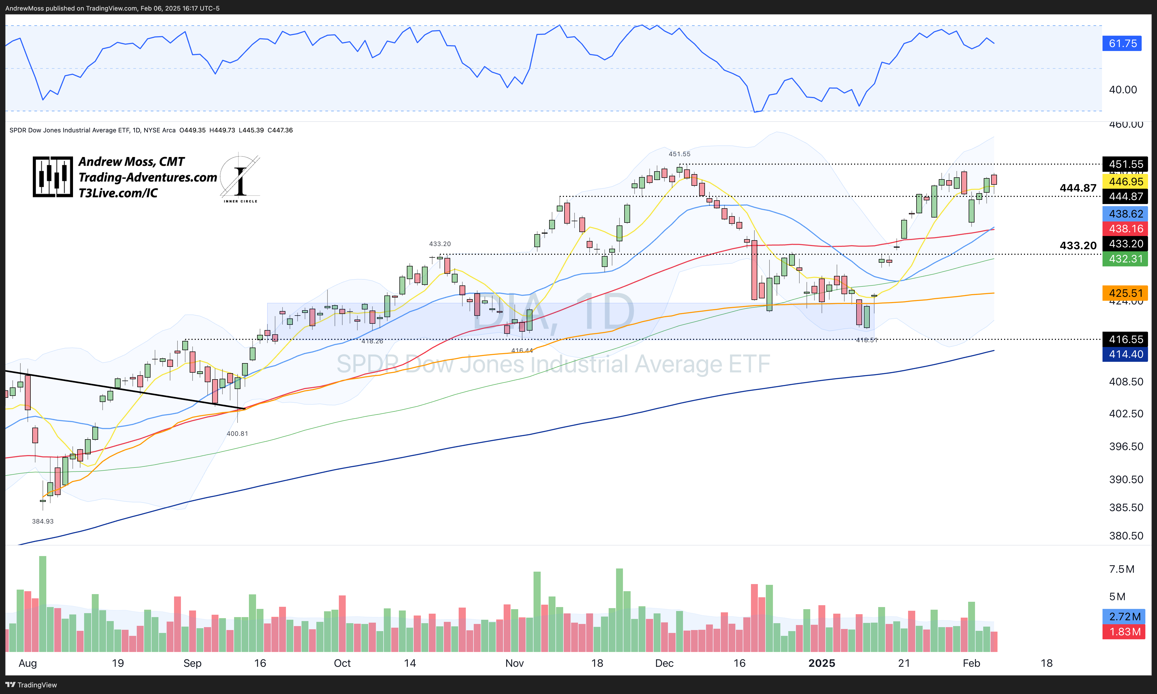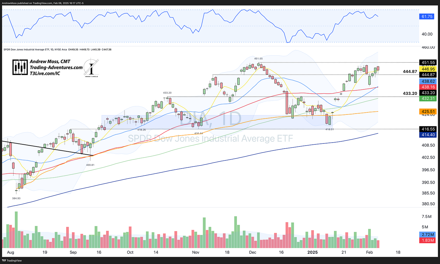 DIA closed virtually on the 8-day MA, staying comfortably contained in the ~$444 to $451 channel. Energy builds for a trip to new highs as the gap between the 8 and 21-day MAs narrows.