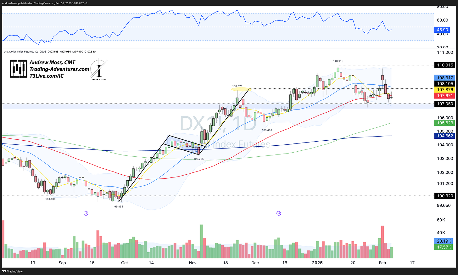DXY After failing to make a new high on Monday’s rally, US Dollar futures have come back down below the 8/21/50-day MAs and are testing the $107.05 pivot area. The tailwind for stocks has been evident and observable this week.