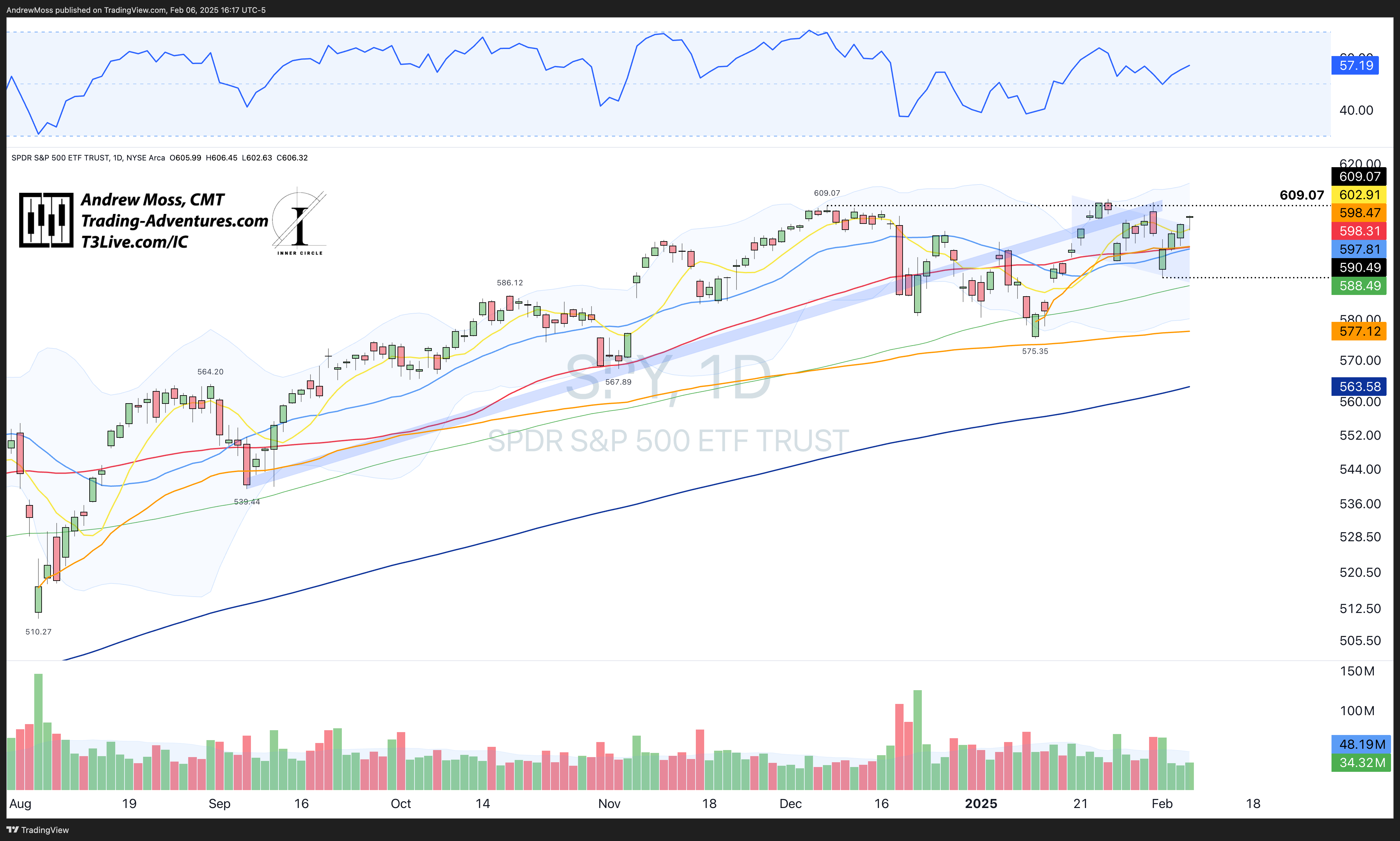 SPY continued the bounce into day four and has moved above the potential bull flag while trading back above all key moving averages. Pivot highs are near $609-$610 for potential resistance, while support could come in first at the 8-day MA $602.91 and the ~$598 — the 21 and 50-day MAs and the Jan. 13 pivot low AVWAP.