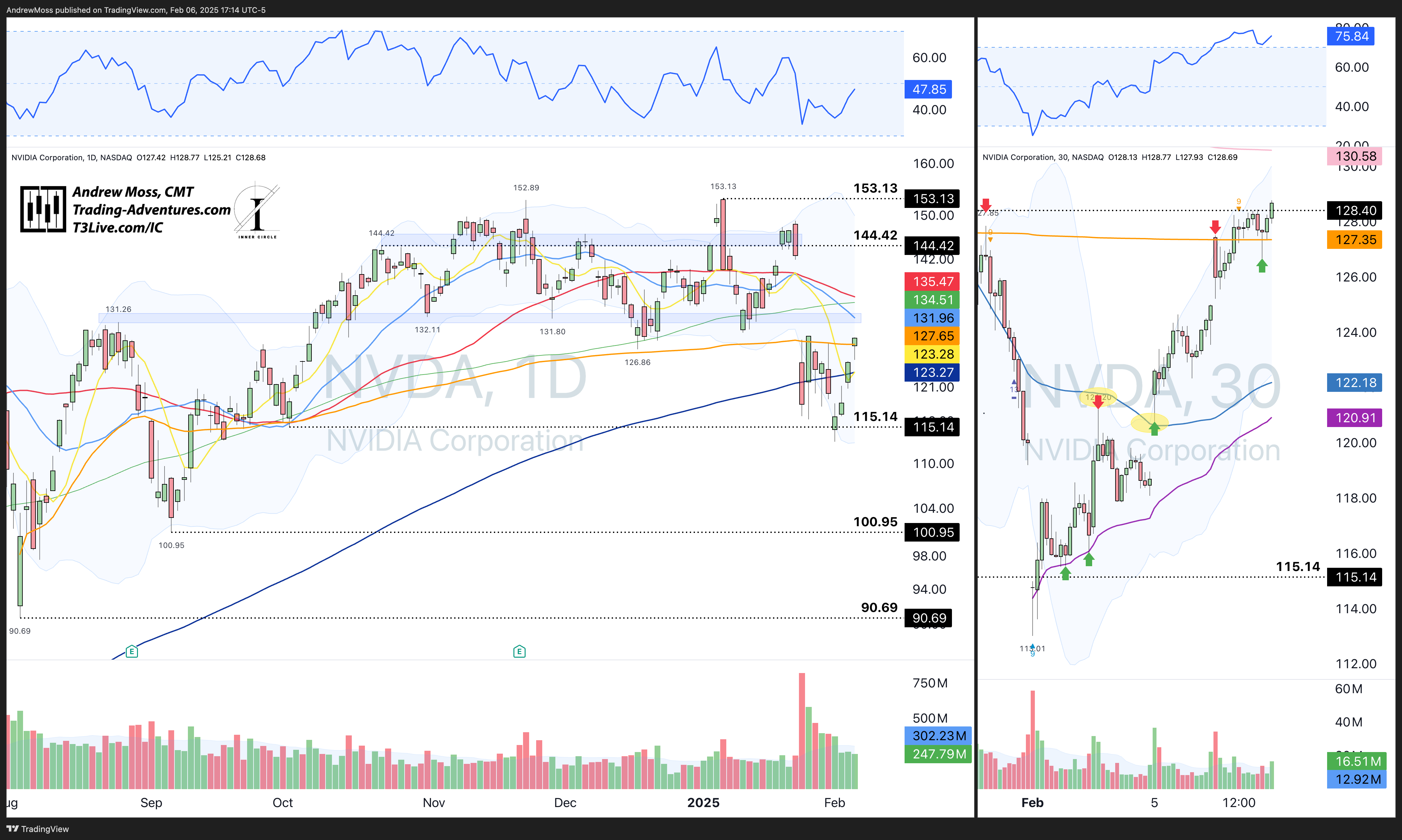 NVDA — After breaching and then quickly recovering (signal) the $115.14 pivot low Monday morning, NVDA has risen while respecting technical levels very well.