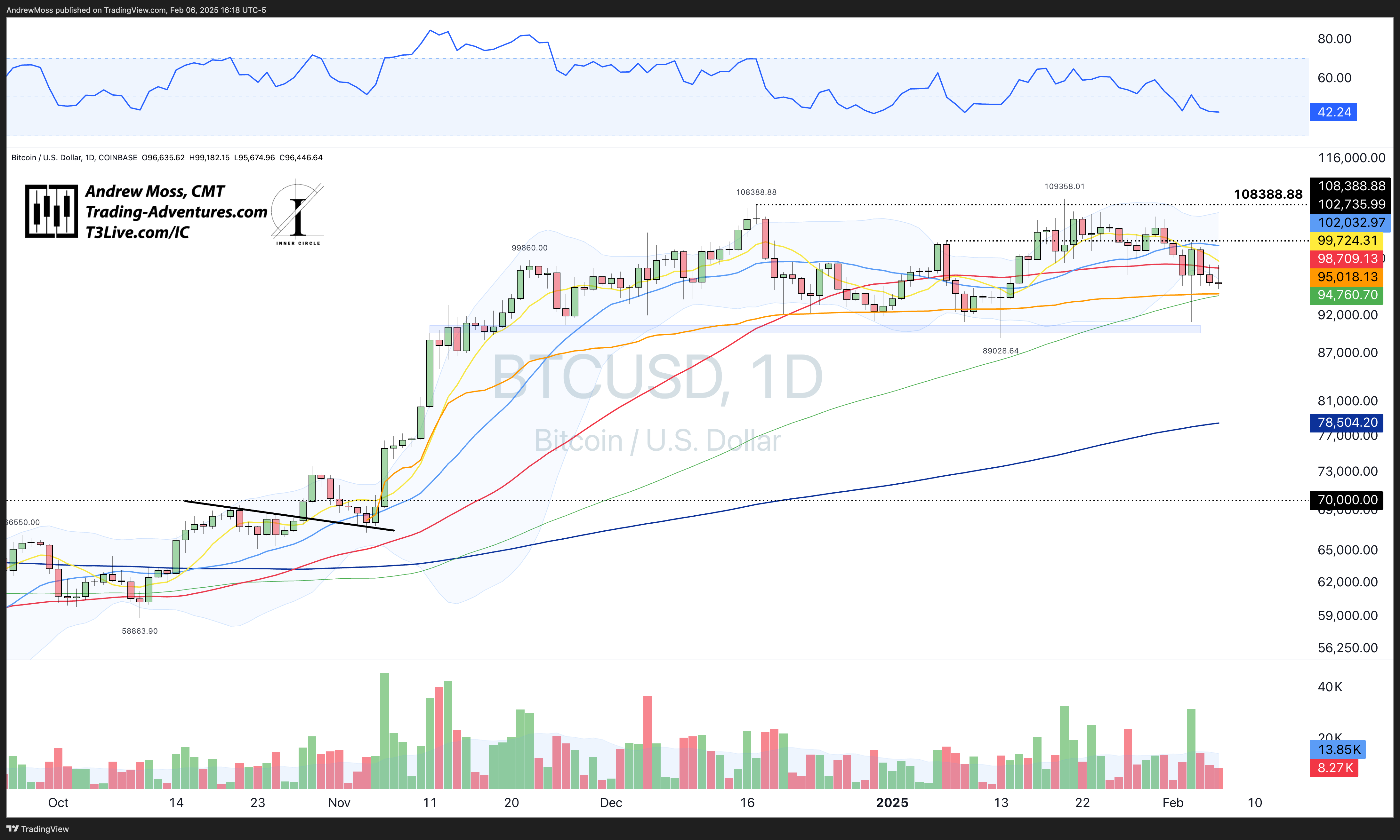 BTCUSD The long consolidation continues as Bitcoin can not build and keep enough traction to move into new highs. It is below the 8/21/50-day MAs, while the early Nov. AVWAP and the 100-day MA are colliding near $95,000. Maybe those factors can squeeze it enough to force a break in one direction or another.