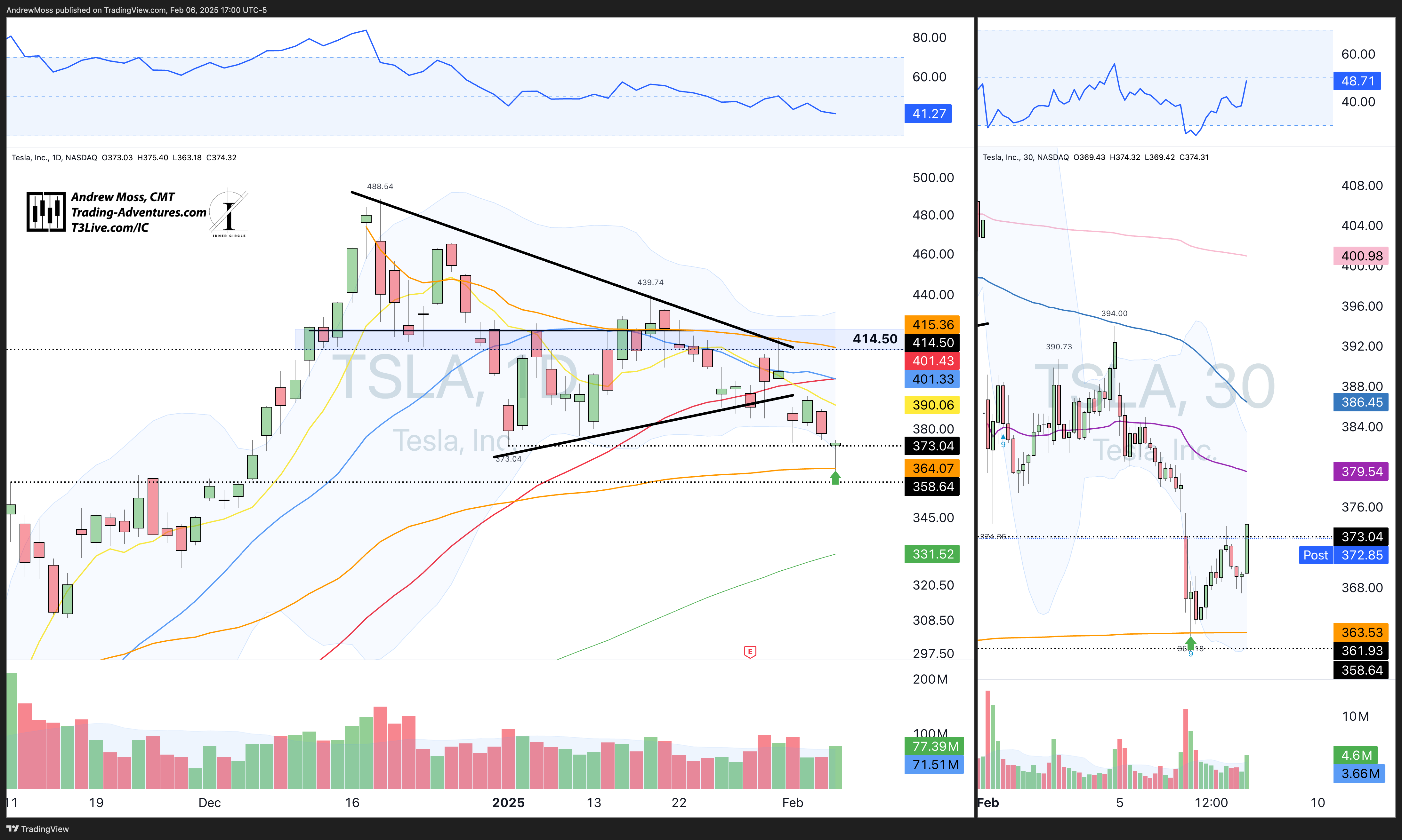 Today, TSLA touched its AVWAP from Oct. ‘24 earnings and began to bounce. Then, after a couple of attempts, it was able to clear the $373.04 pivot low, closing up nicely from where it traded earlier in the day.