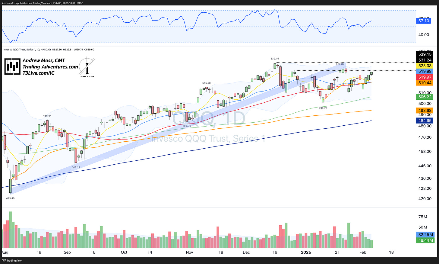 QQQ is working hard to maintain the ‘higher low’ and establish a new ‘higher high.’ To confirm this, we need a close above $531.52, and a move back over $539.15 would add to the strength.