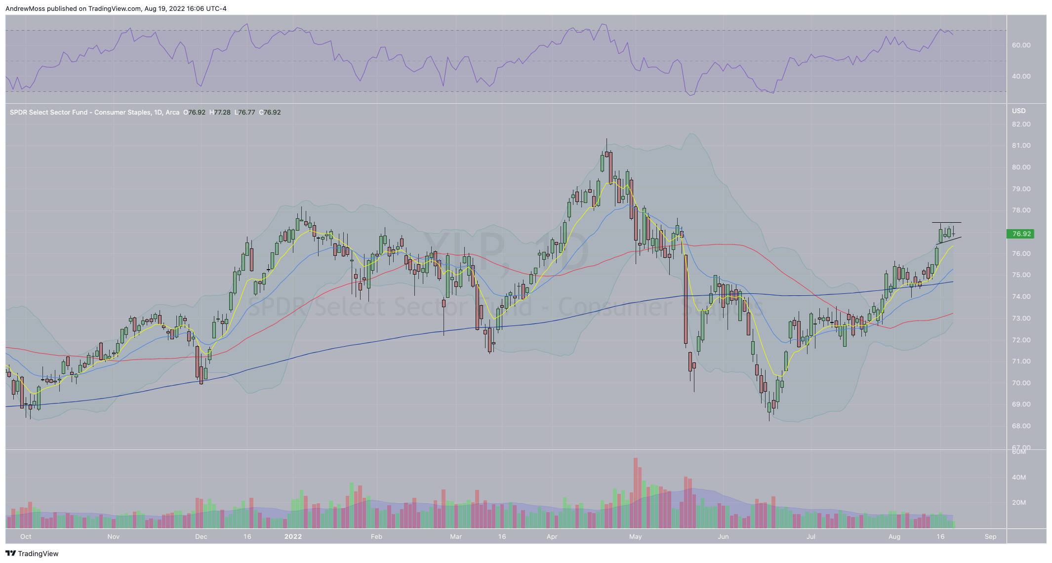 XLP 0.00%↑ Consumer Staples have formed a high and tight bull flag and looks like it wants to go higher.