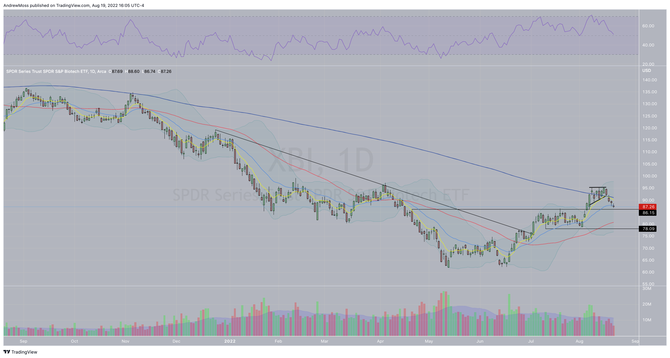 XBI 0.00%↑ Biotech stocks couldn't break up from the potential continuation pattern. Instead, it is back below the 8/21-day EMAs.