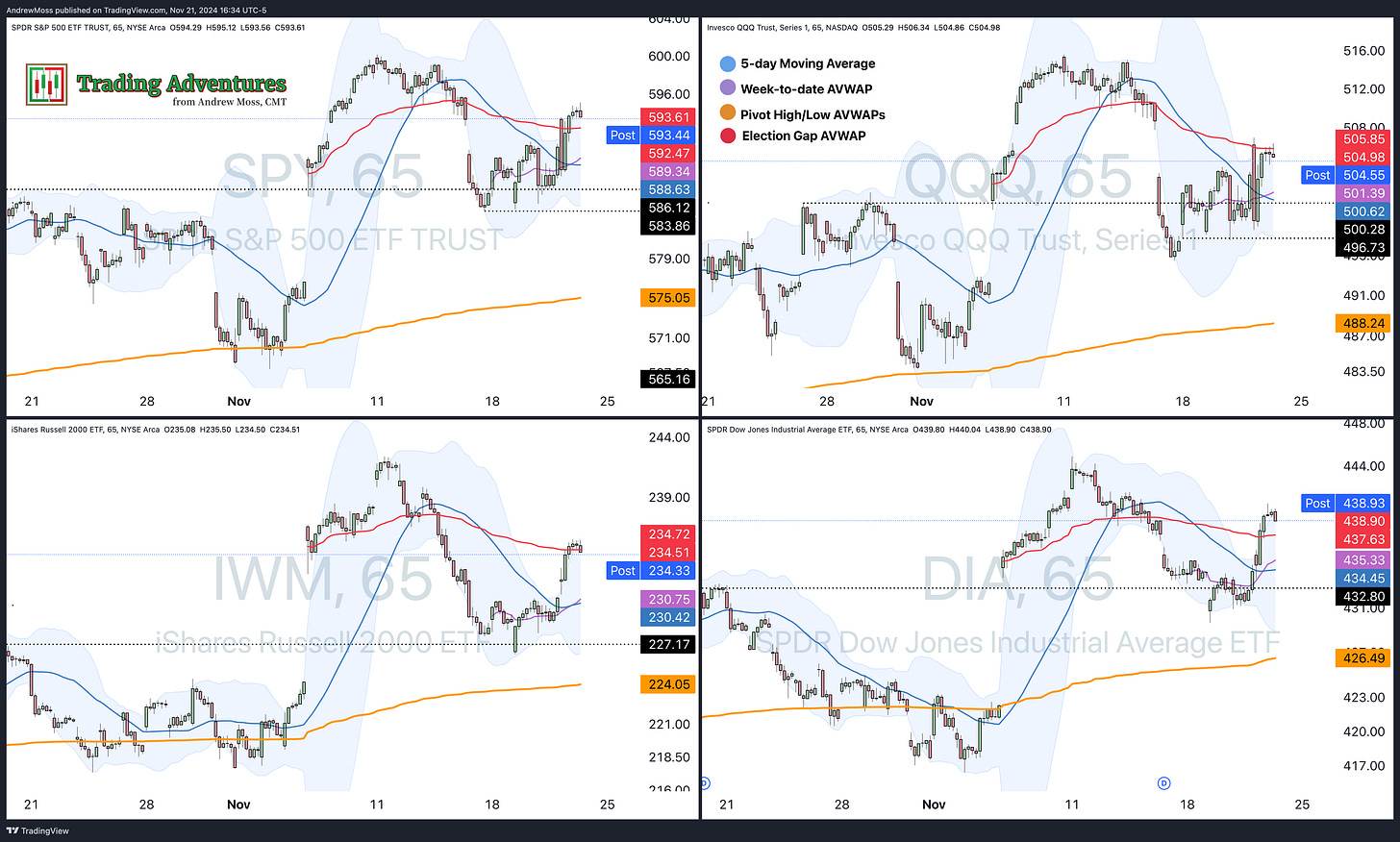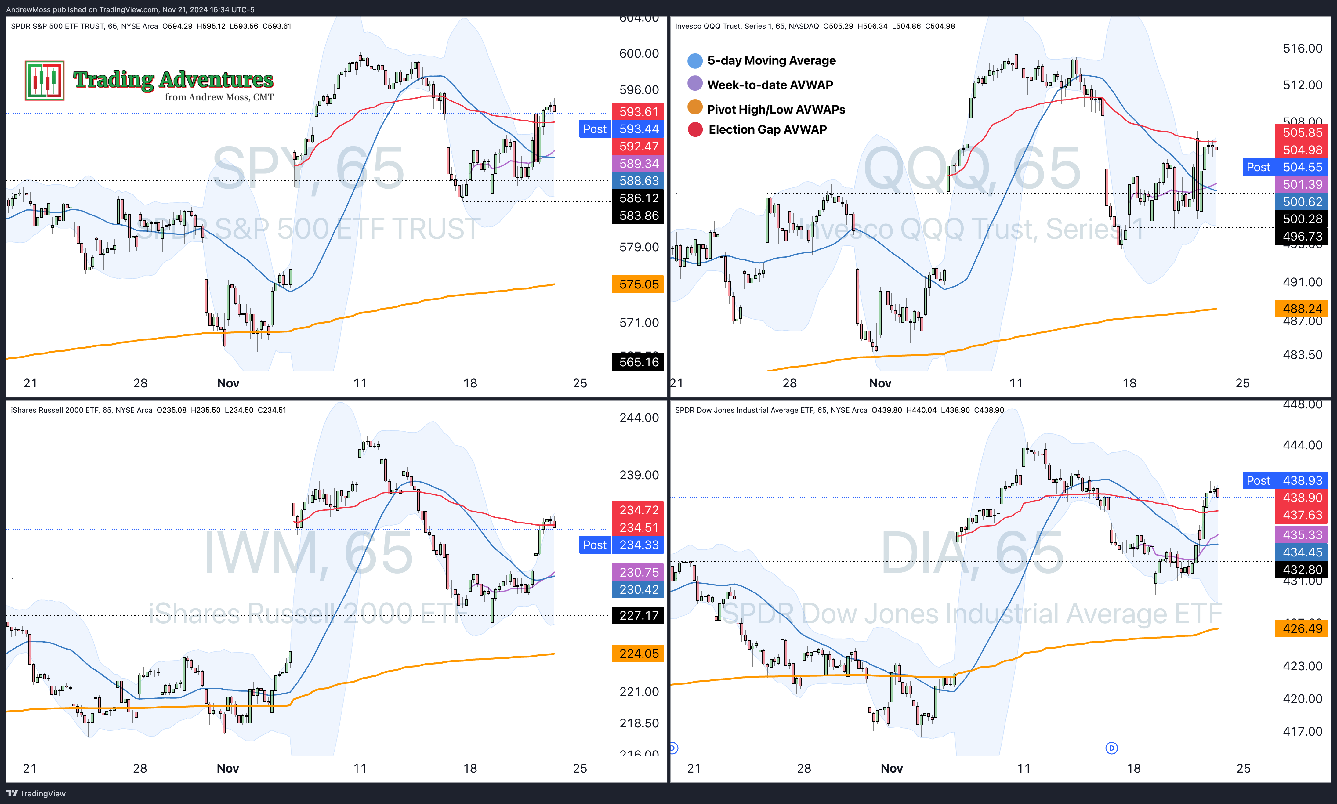 The major indexes are all higher for the day and the week, trading over their 5-day MAs and with two of the four back over the post-election anchored VWAPs, which we’ve been watching closely, signaling that short-term momentum is trying to return.