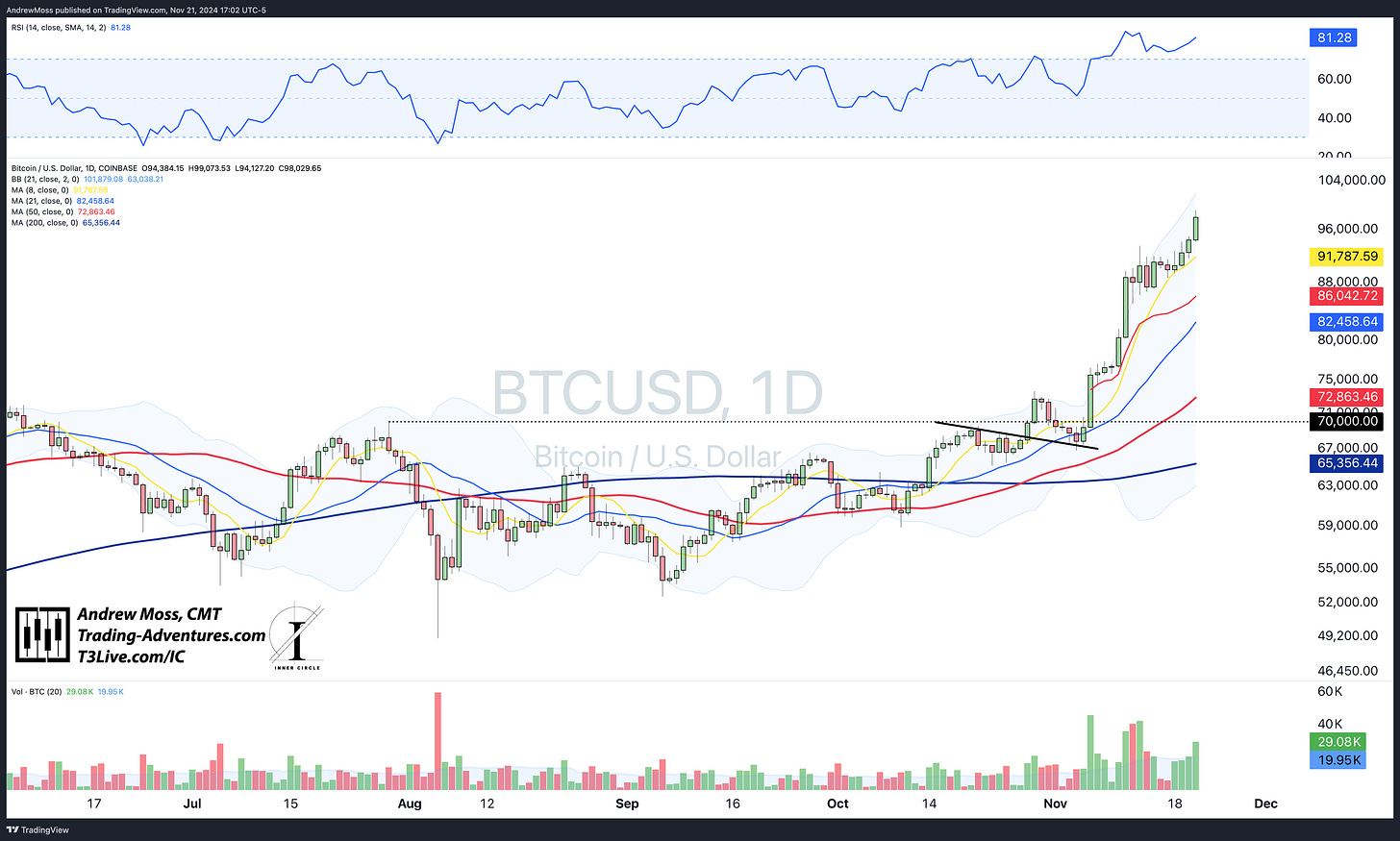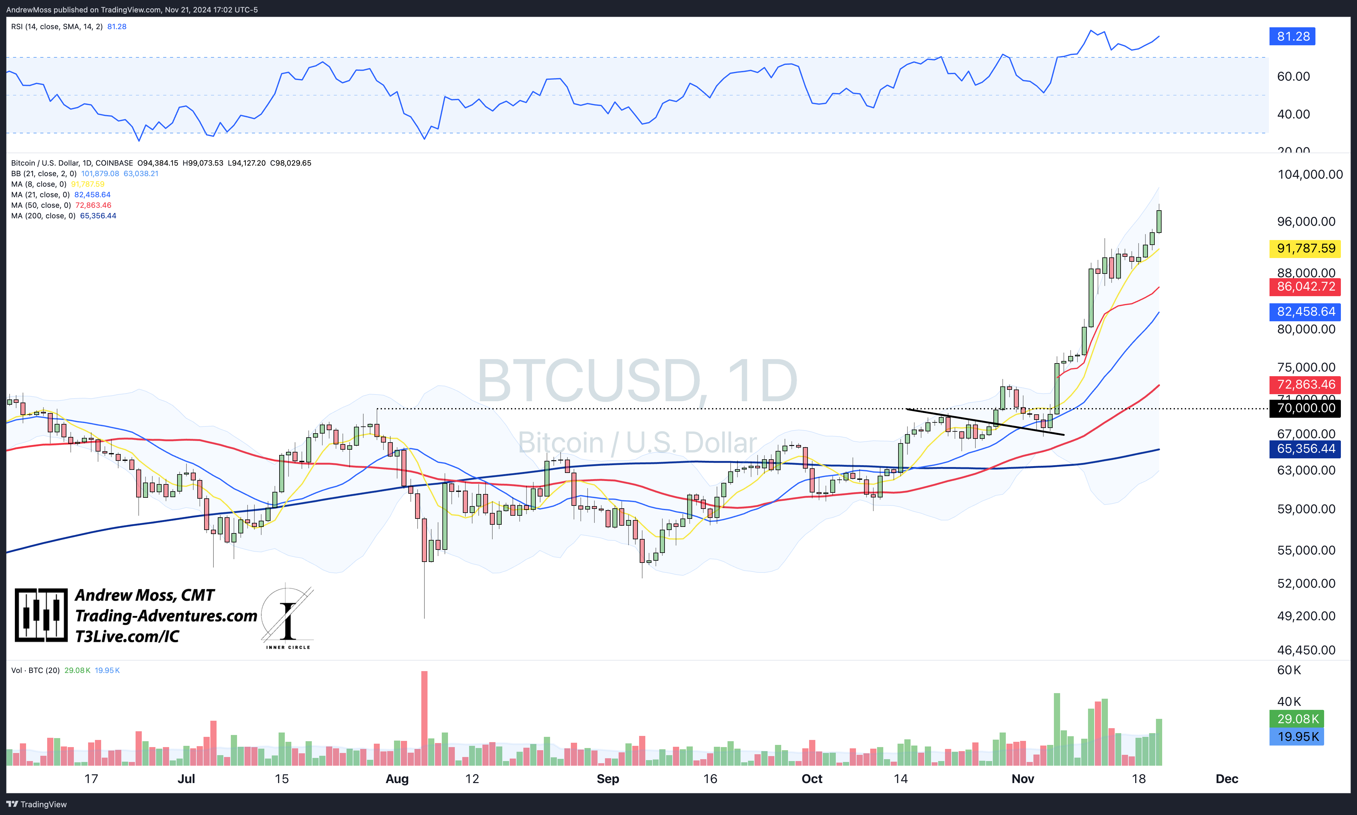 BTCUSD keeps making new highs, trading above $98,000 this afternoon.