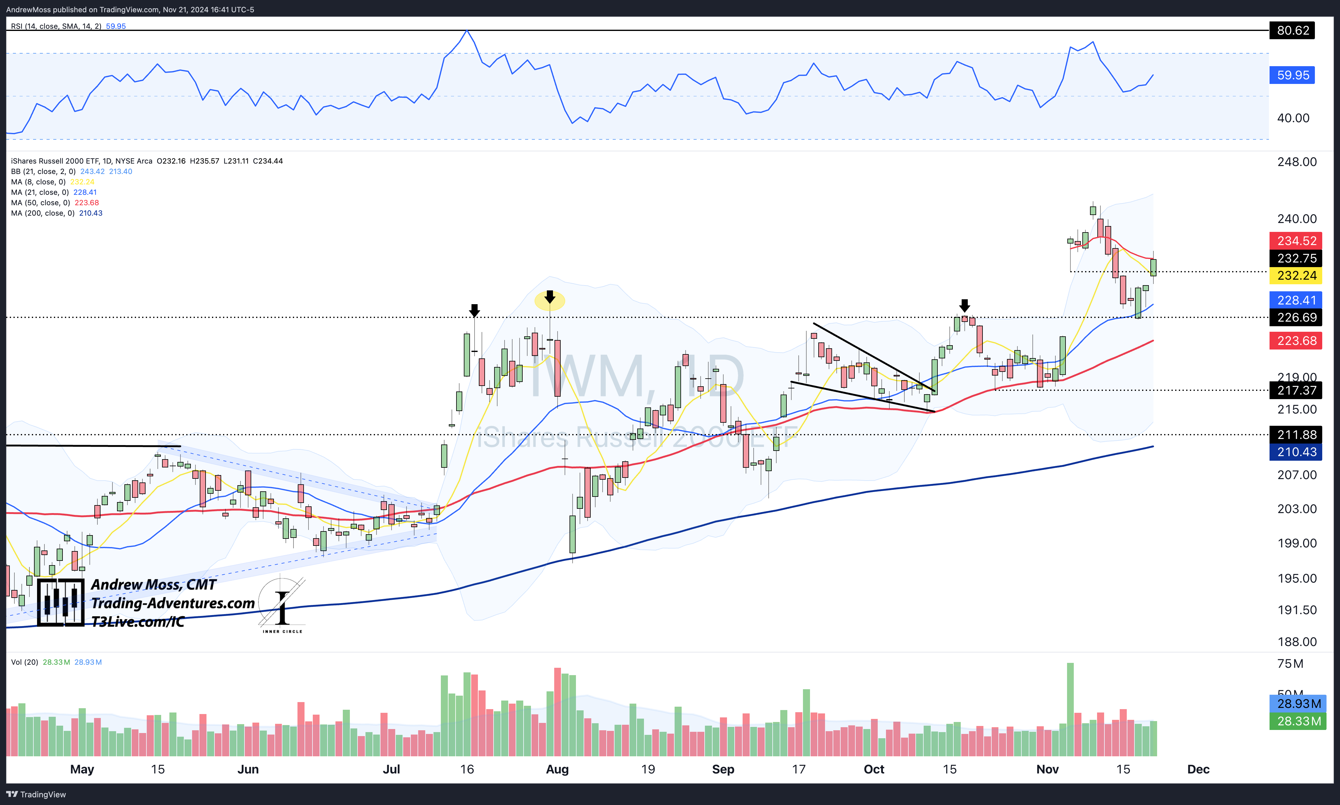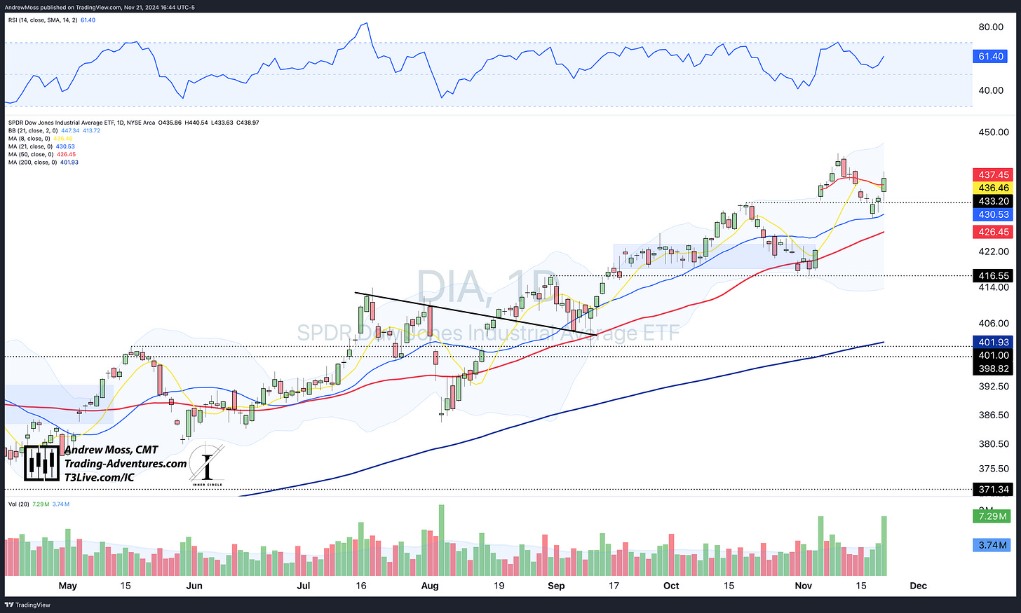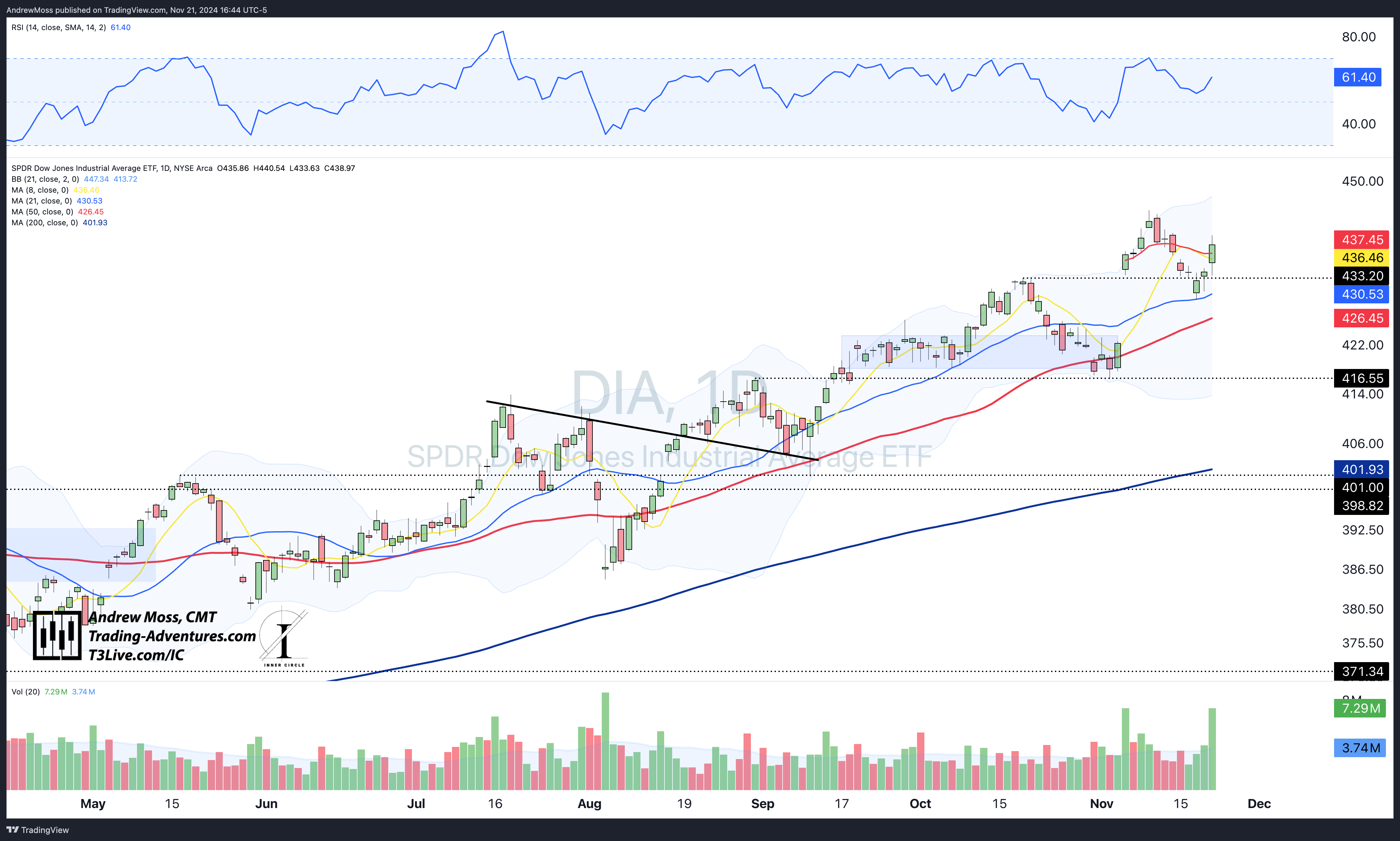 SPY closed above the 8-day MA and post-election AVWAP, closing the recent Friday morning gap after wrestling with the 21-day MA for a week. RSI held above 50 for this pullback, and the volume has been about average.