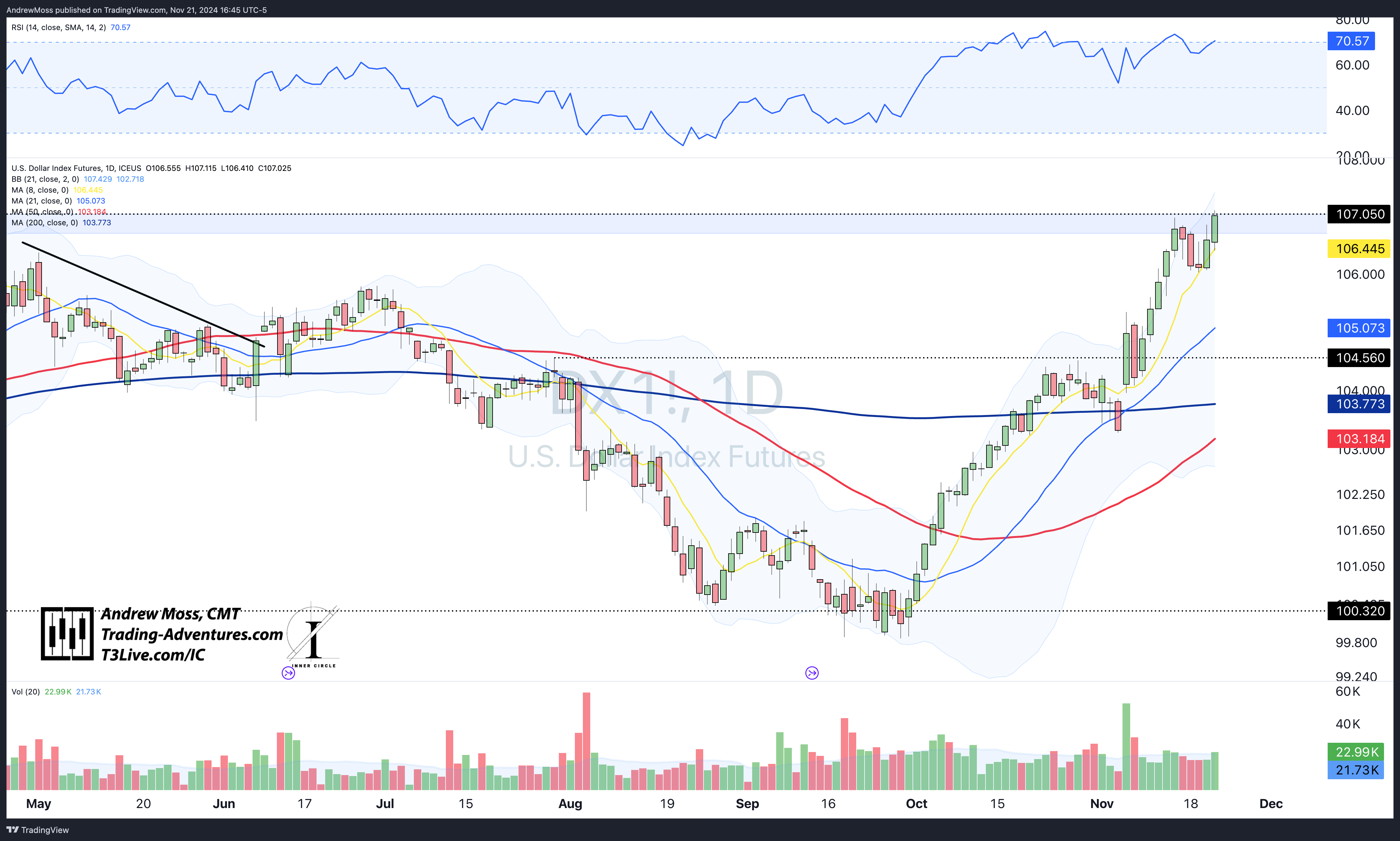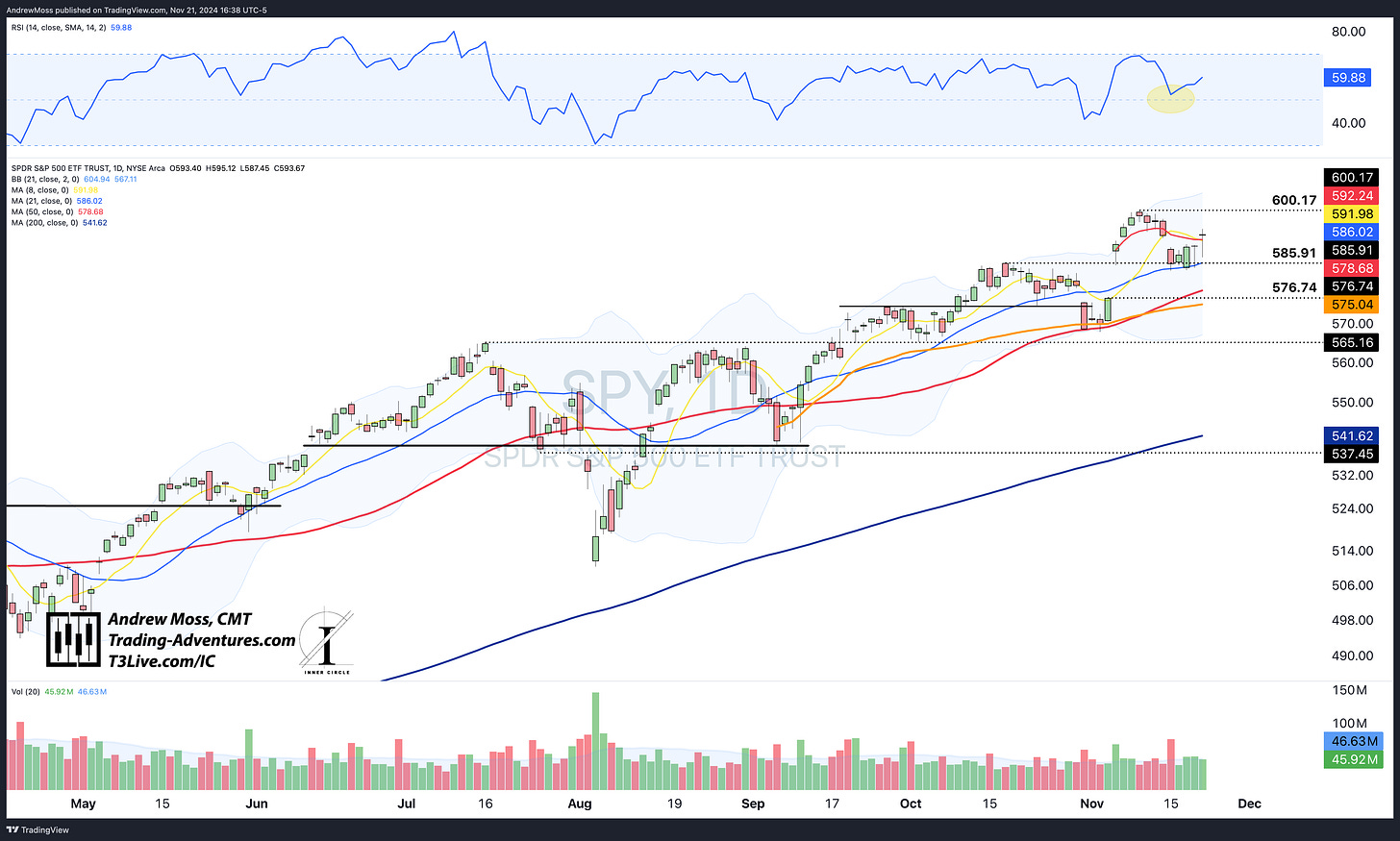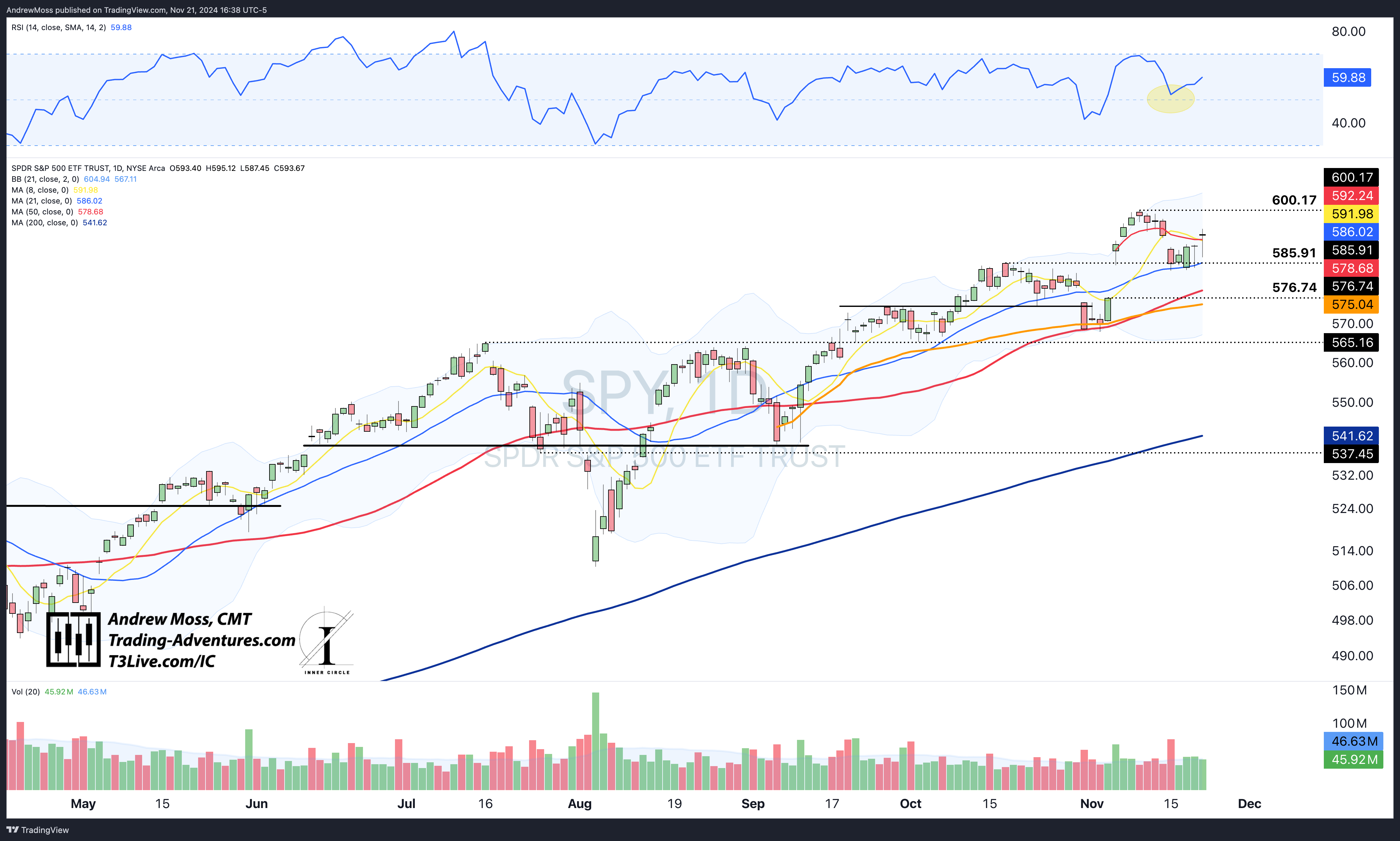SPY closed above the 8-day MA and post-election AVWAP, closing the recent Friday morning gap after wrestling with the 21-day MA for a week. RSI held above 50 for this pullback, and the volume has been about average.