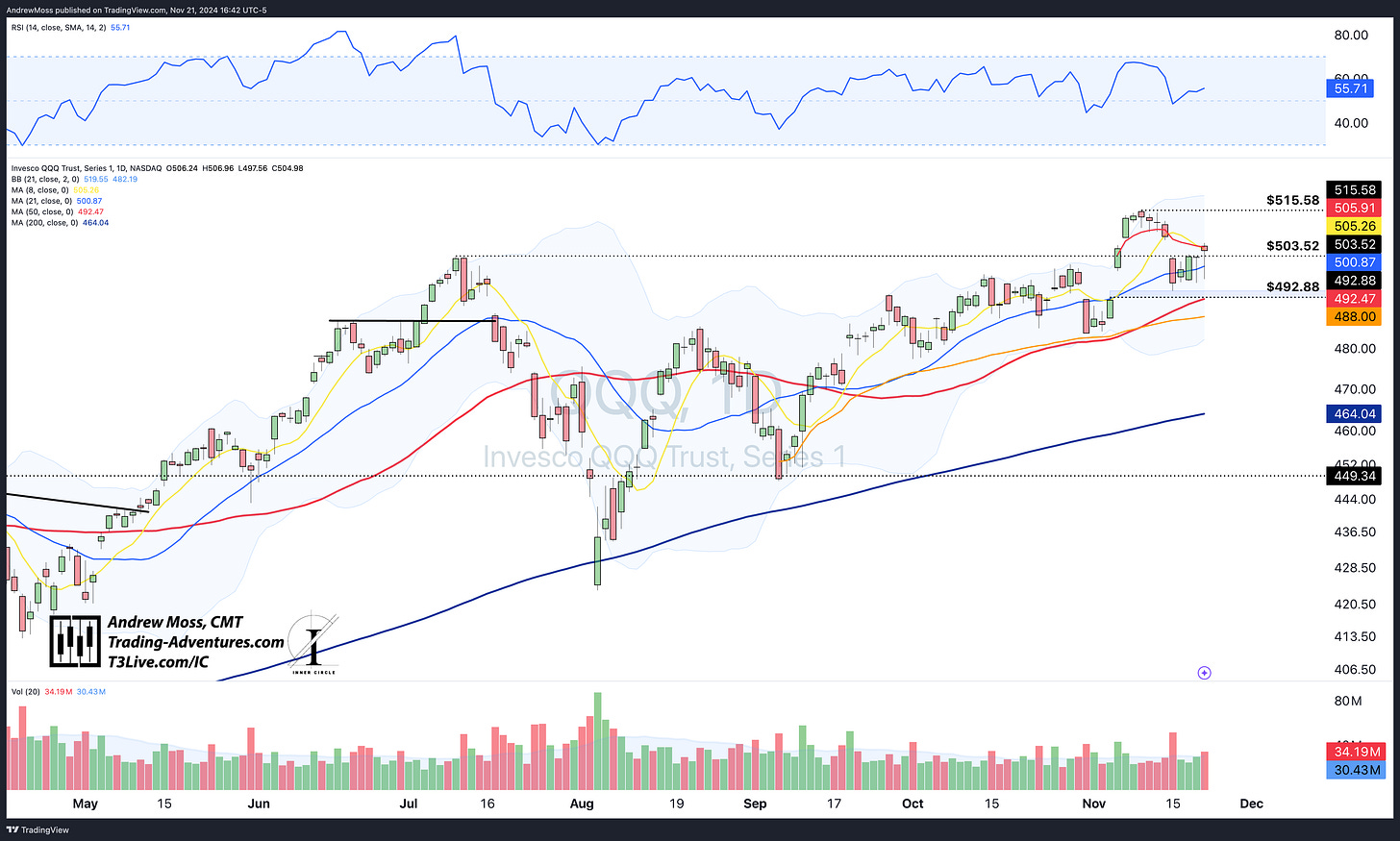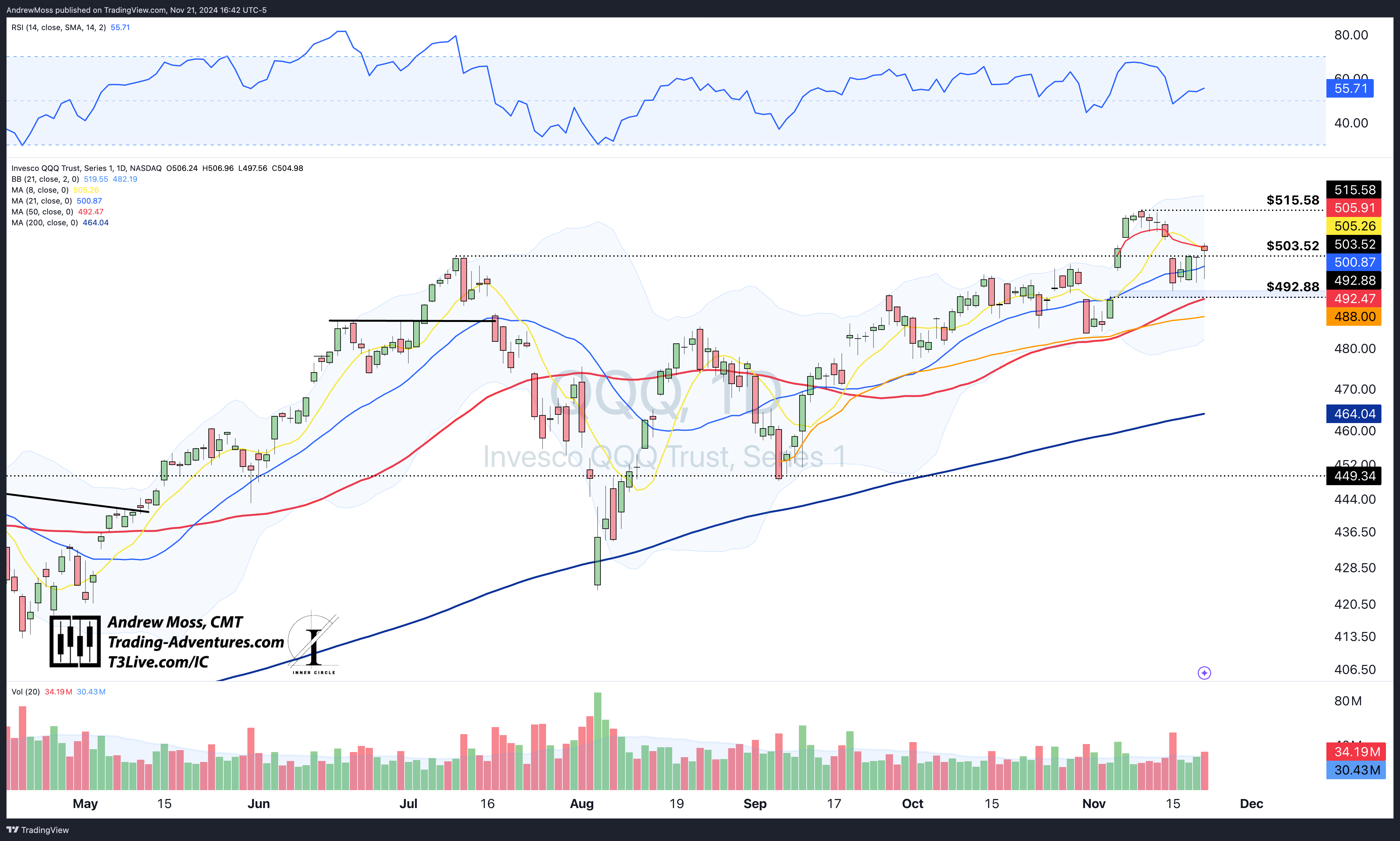 QQQ closed just under its 8-day MA and the post-election AVWAP after trading above for much of the day. It did stay over the $503.52 pivot level, though it has yet to fill the recent gap.