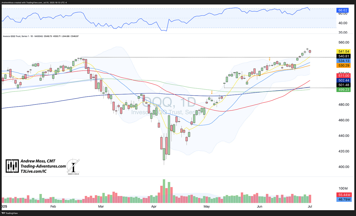 The Dow and small caps broke out with force. SPY held its ground just below the highs. And while tech pulled back, the selloff in QQQ was bought steadily and left no lasting damage.