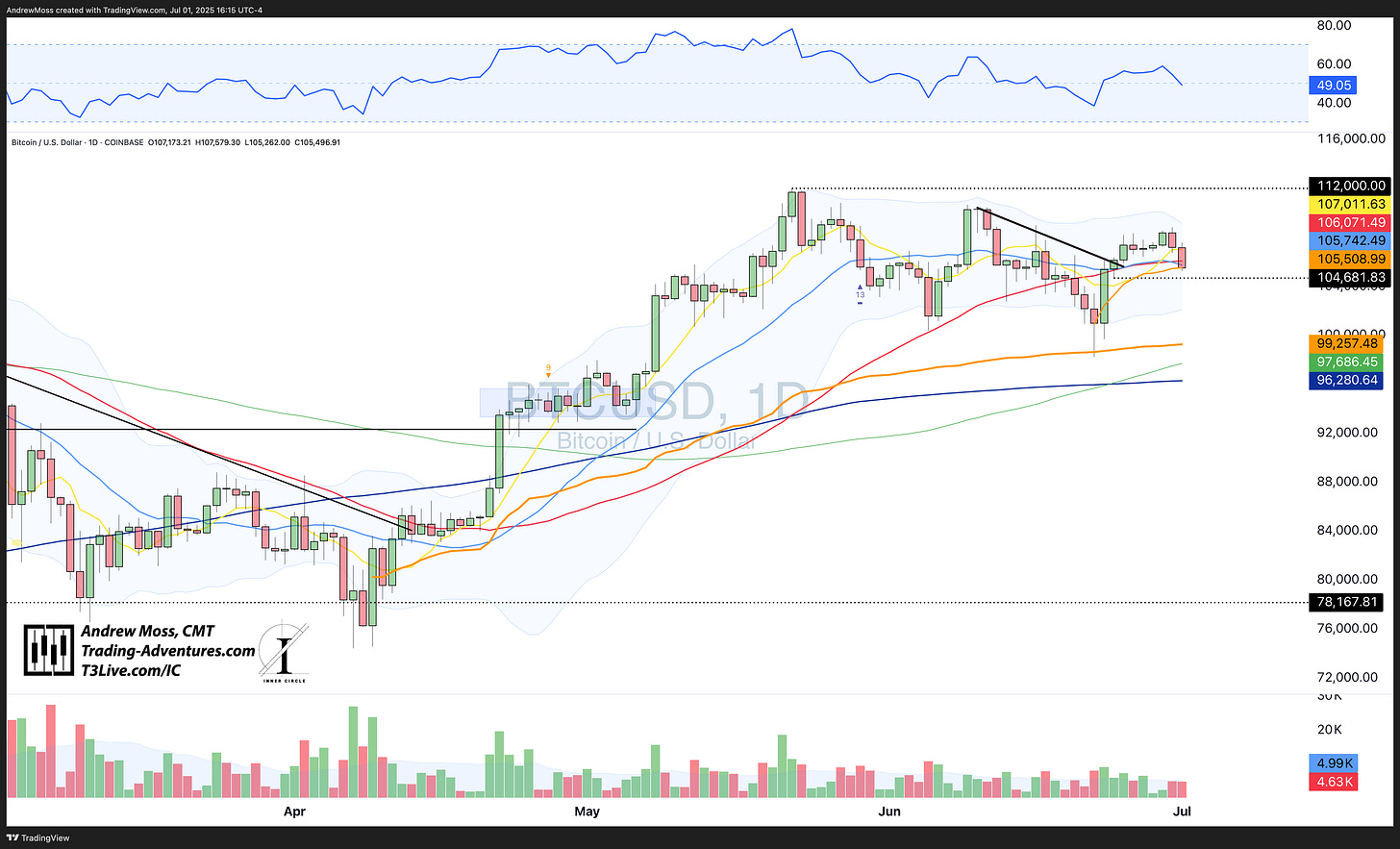 BTCUSD After slipping below the 8-day MA, price is now testing a confluence of the 21-day MA, 50-day MA, the recent pivot low, and AVWAP—all clustered near the $104,000 to $105,000 area. If it breaks, the next likely destination is closer to $99,000. Structure remains intact for now, but it’s a moment worth watching.