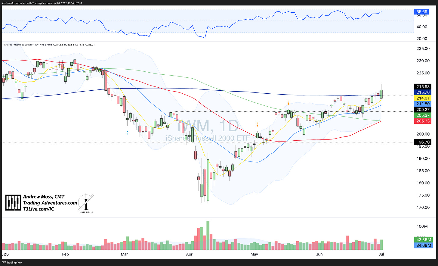 After days of grinding, small caps pushed above the 200-day MA with some authority. Price dipped to the 8-day MA early, found support, and rallied through the $220 level before settling back to close above the upper Bollinger Band. It didn’t finish at the highs, but the action was constructive. Volume was strong, and RSI has room to run—this move looks real, even if it cooled into the close.