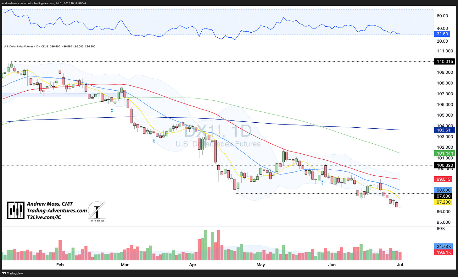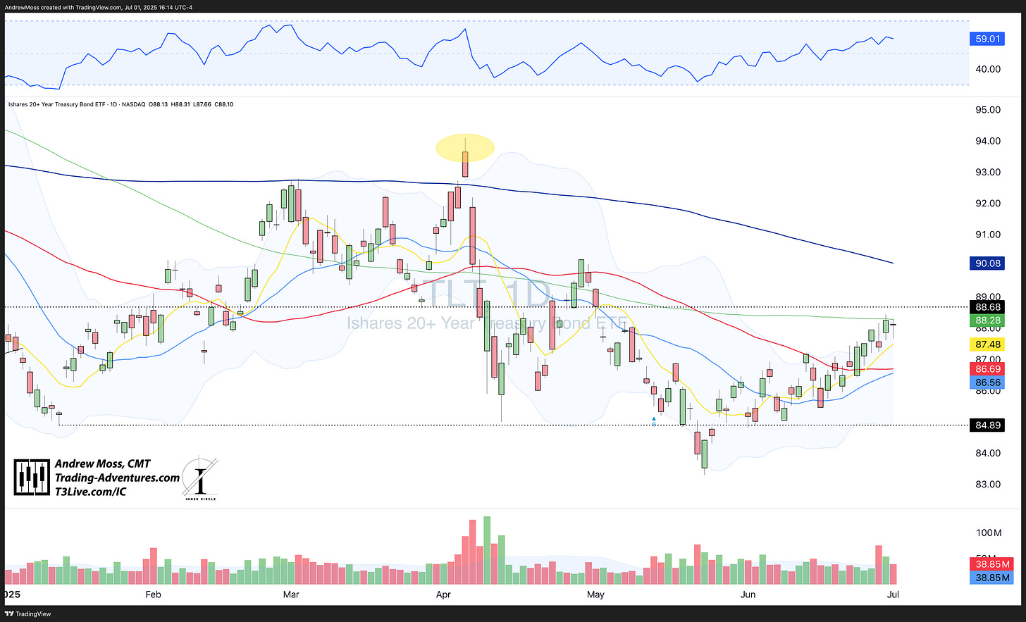Bonds extended their move with another session testing the 100-day MA—a level that’s held the past two days. Progress here has helped ease rate pressure, which in turn has supported equity strength. The next question is whether TLT can break through this level and clear the $88.68 pivot overhead. For now, the trend is supportive, but not resolved.