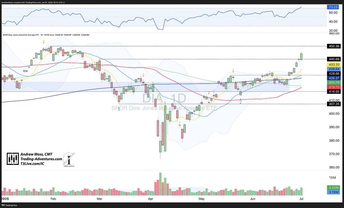 Today was the third straight session where price held entirely above the upper Bollinger Band—a rare show of strength. The move pushed well past the $440.69 pivot from early March, as the Dow 30 index gains 6% over the last six sessions. Price is now approaching the highs, and RSI has crossed into overbought territory at 72. The trend is powerful, but increasingly extended. Still, no signs of slowing just yet.