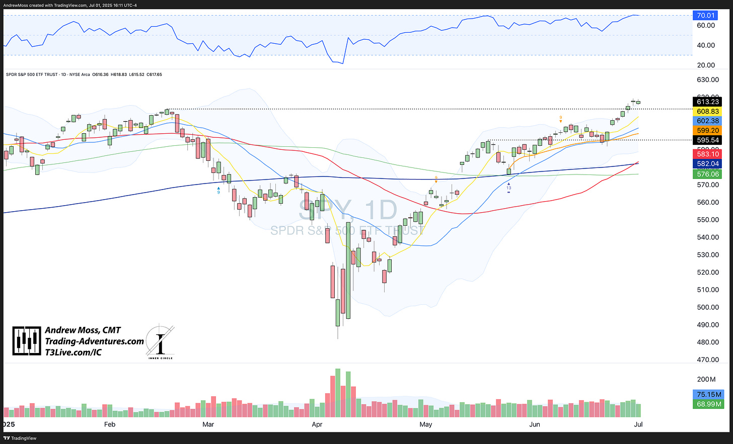 The breakout in IWM adds credibility to the recent broadening we’ve been tracking. DIA continues to lead with undeniable momentum. SPY is resting near highs. Even with QQQ pulling back, the larger trend hasn’t broken—just shifted tone.