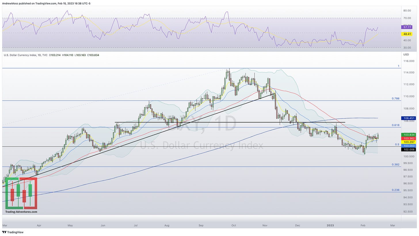 The dollar continues to be a potential “red flag.” Actually, it’s in a bull flag pattern and trying to move higher. So far it doesn’t seem to be hampering stocks much though. Not US stocks, at least.