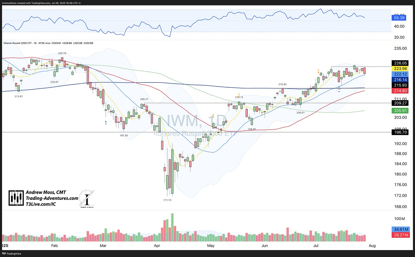 QQQ continues to lead, holding its upper Bollinger Band and staying comfortably above short-term moving averages. But like SPY, it saw intraday selling, and earnings from key components will be the next directional driver. Until then, expect a wait-and-see tone.