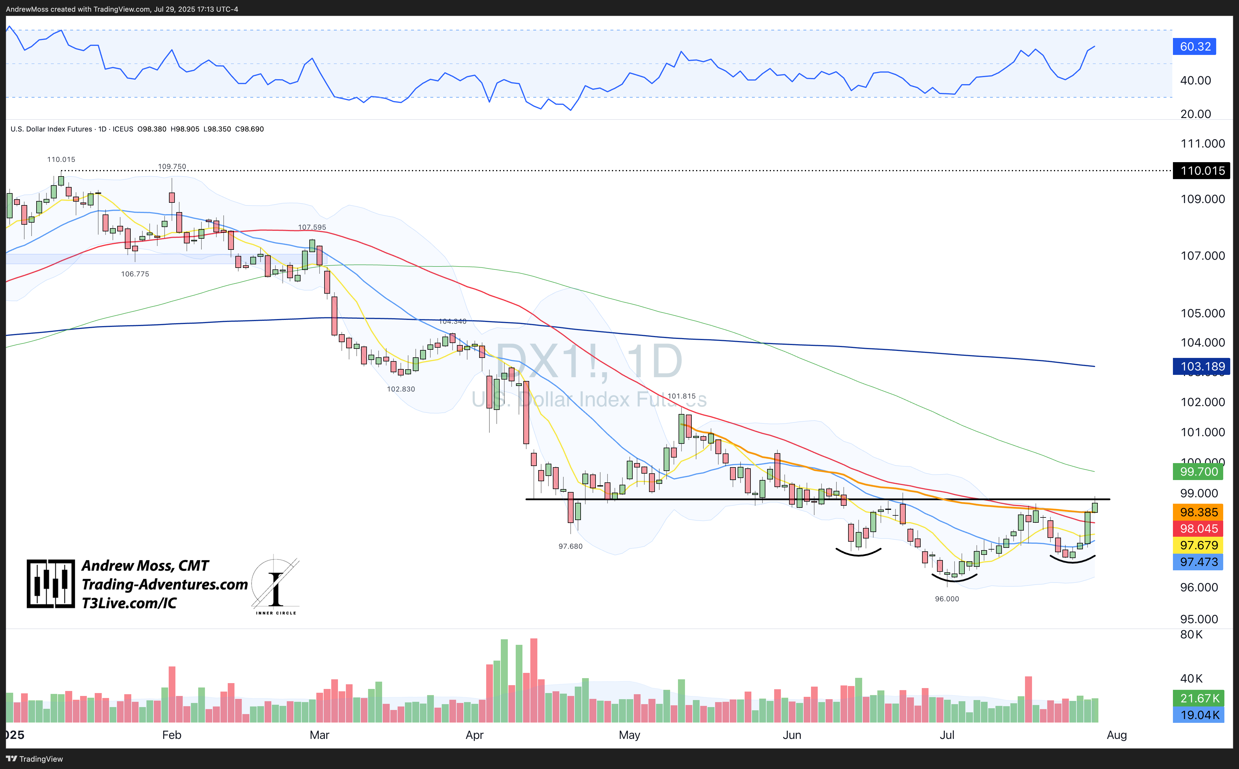U.S. Dollar Futures (DX1!) are pushing into a key resistance area near 99 after forming a higher low and breaking out from a rounded bottom pattern. Price is now challenging the neckline of that base while reclaiming all short-term moving averages. Momentum is building — RSI has cleared 60 — and there’s some above. This strength adds weight to the macro tone of “wait-and-see,” and could pressure risk assets if it continues.