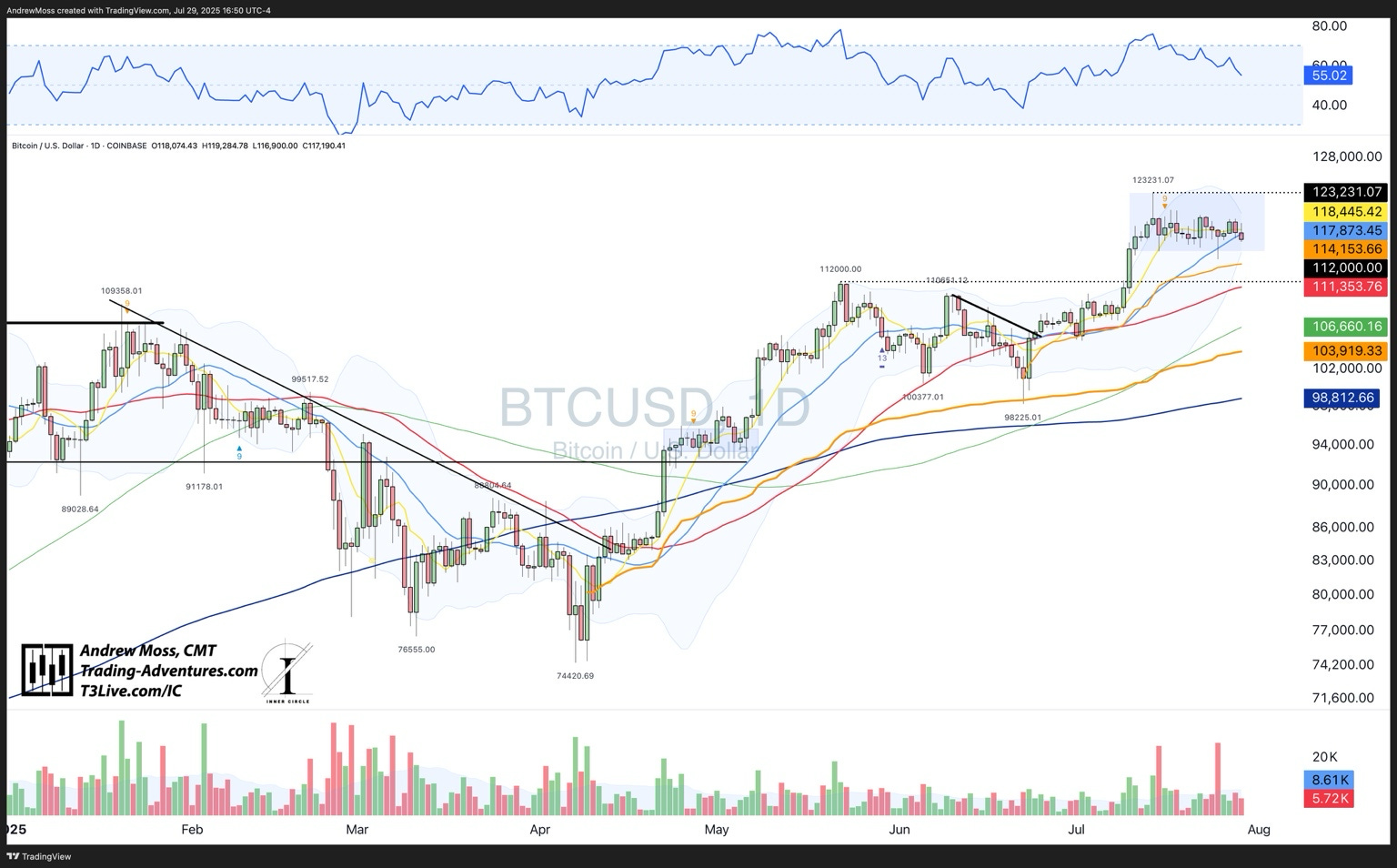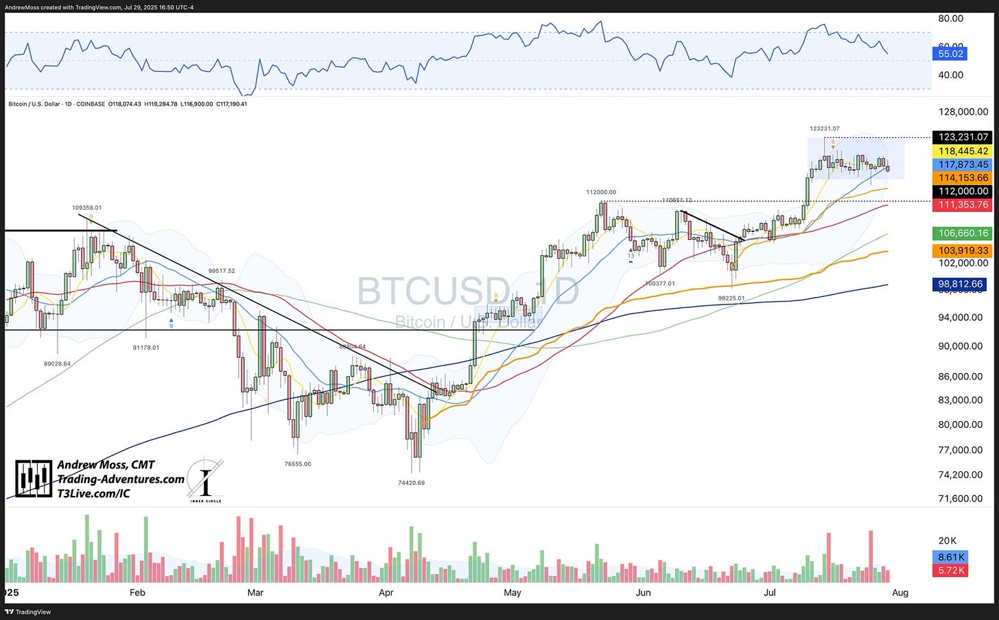 The range between ~115,000 support and ~123,000 resistance remains well-defined, and the overall pattern is still constructive — a high-level coil following a strong move off the May and June lows. Volume is declining, suggesting a wait-and-see posture from market participants.