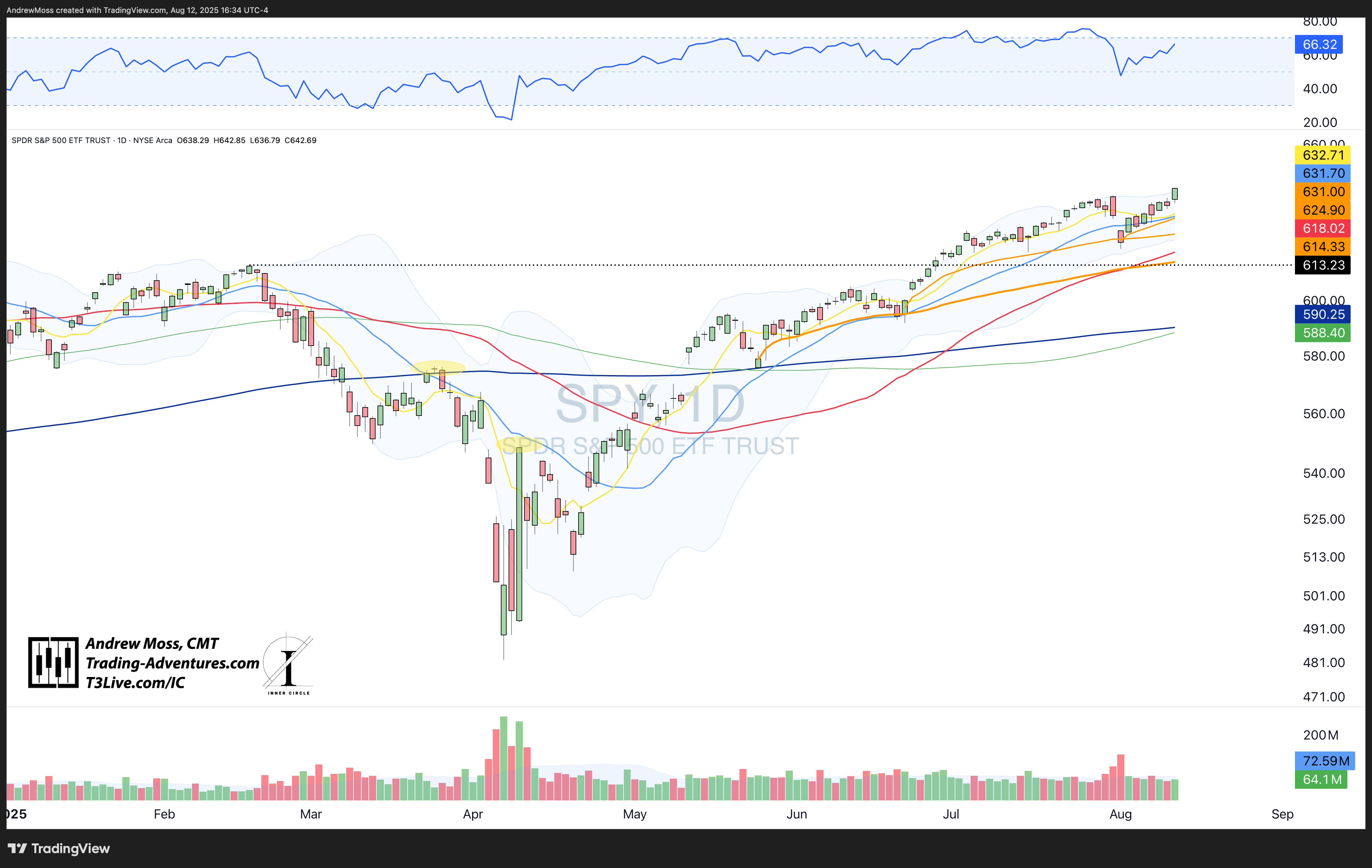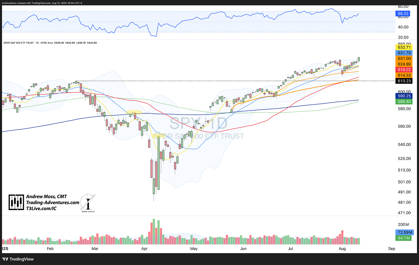 SPY continues the steady grind higher, emphasizing the strength by closing at a new high today. Today’s candle will nudge the Bollinger Bands higher, and RSI still has room before hitting overbought status.