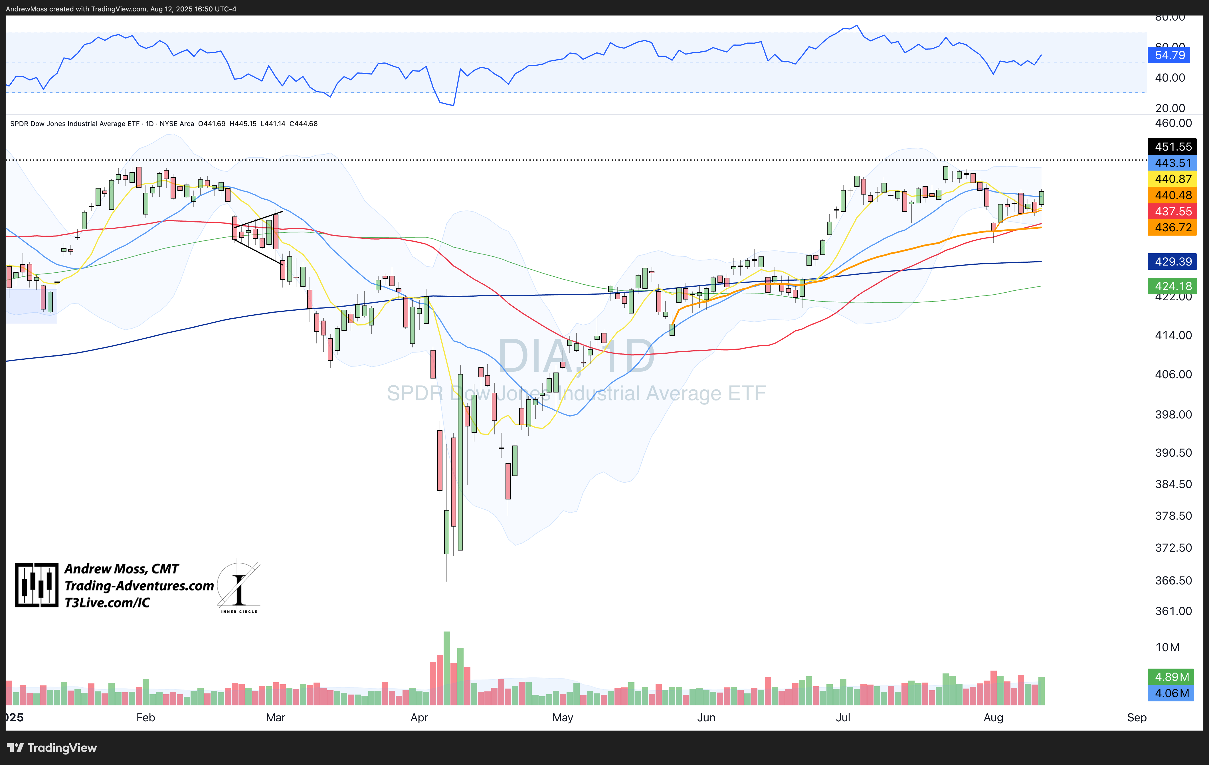 DIA lags the others, but it is back over all the key moving averages now. $451.55 is still the pivot high to watch.