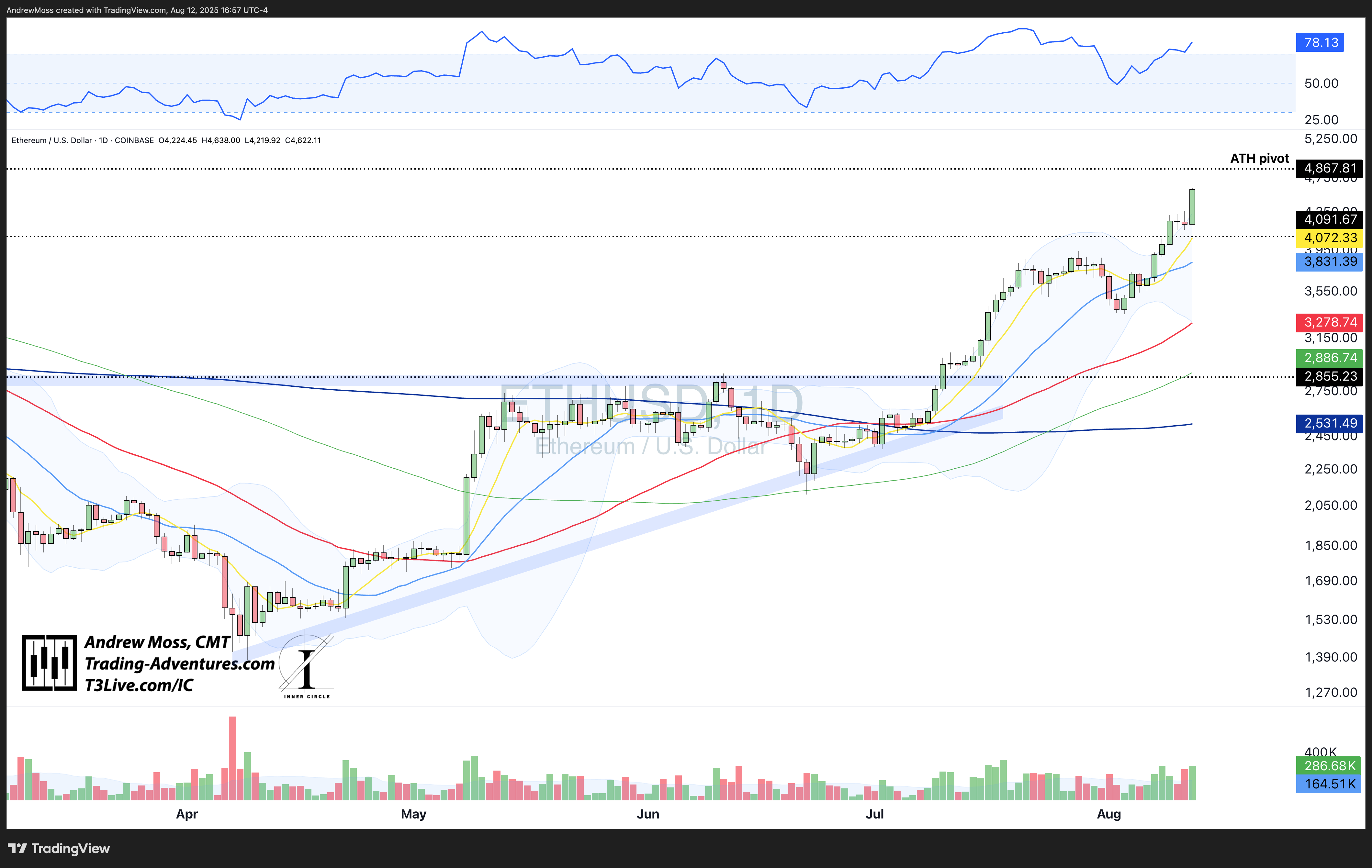 In crypto, BTC’s overnight surge above $122K held most of its gains, while ETH made another push higher toward the all-time high at $4,867.