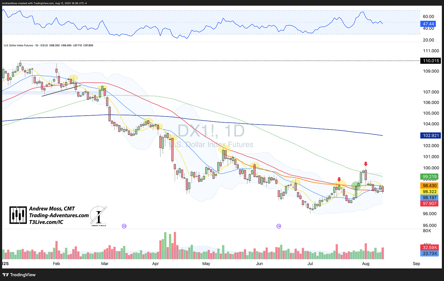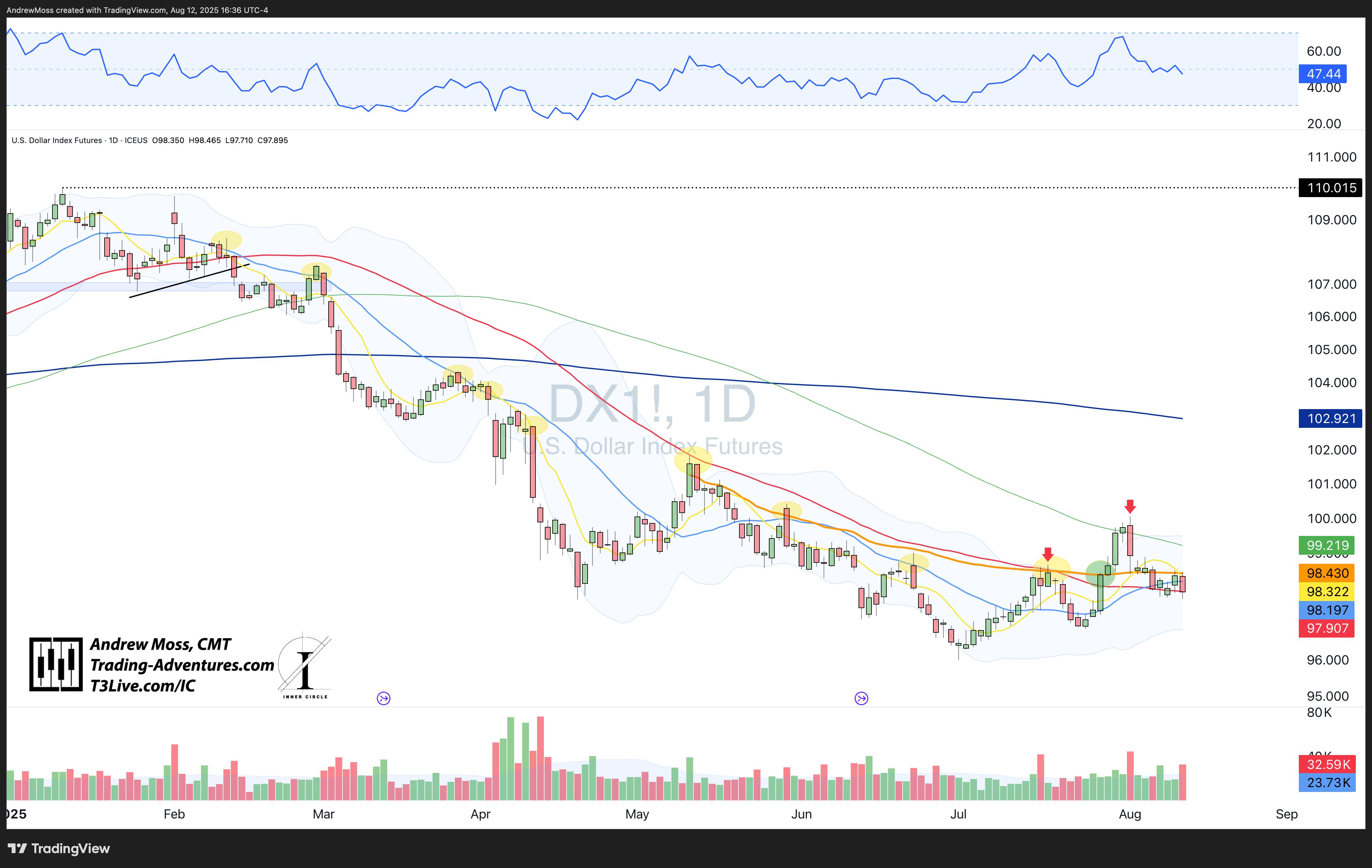 DX1! Dollar futures have had heavy resistance and the AVWAP from the May pivot high. The recent attempt higher was thwarted by the 100-day MA. Now it's at risk of losing all MAs again, which would likely result in a move back to recent lows.