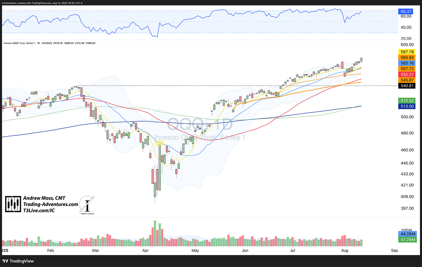 QQQ with another new closing high after regrouping a bit yesterday. RSI at 68, volume is about average, and the Bollinger Bands and moving averages are all rising.