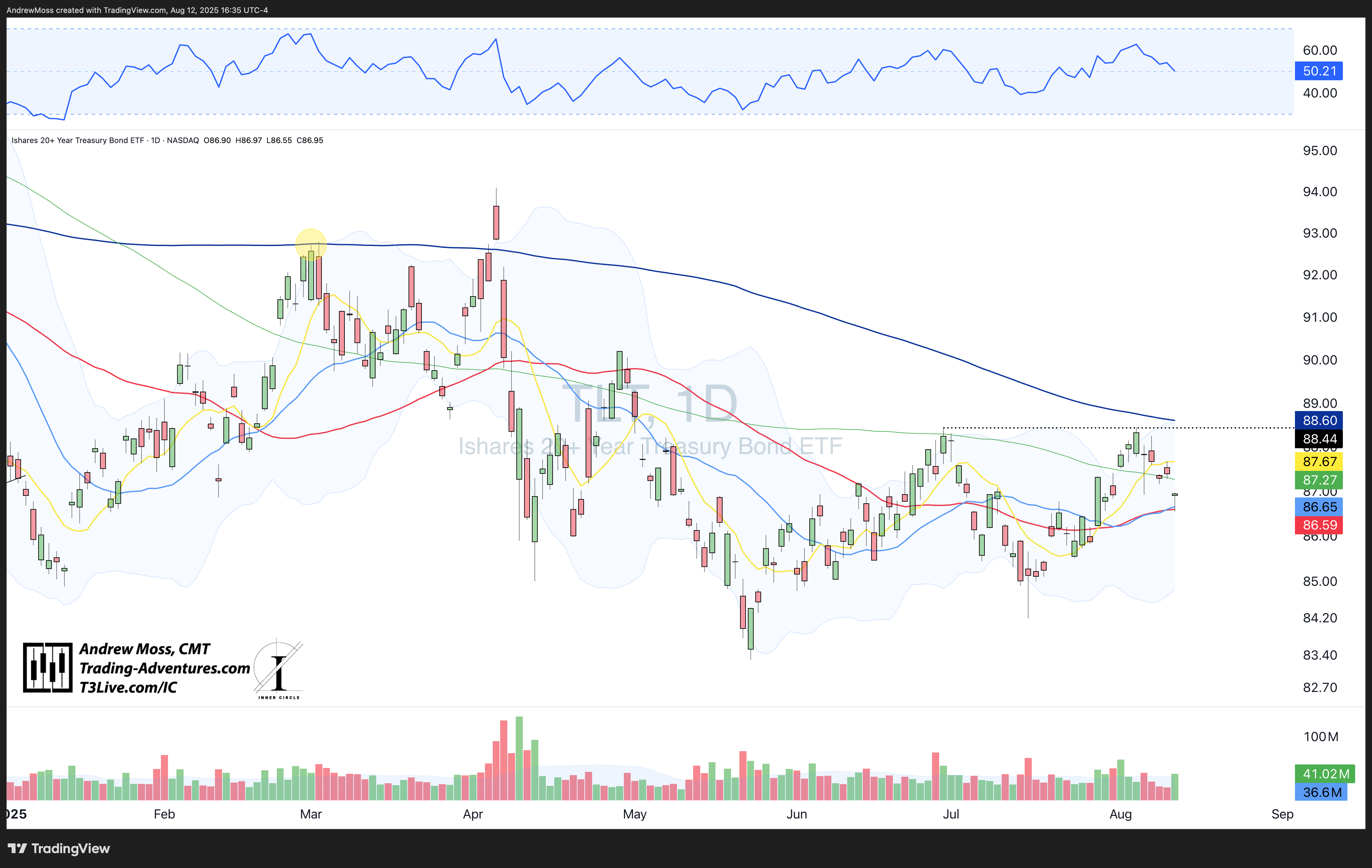 TLT sank back down to the 21 and 50-day MAs. Some support for today, but bonds still need to clear pivots and the 200-day MA just under $89 to change the situation.