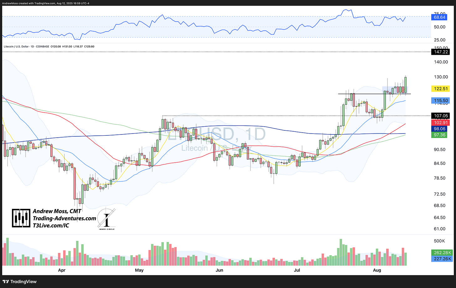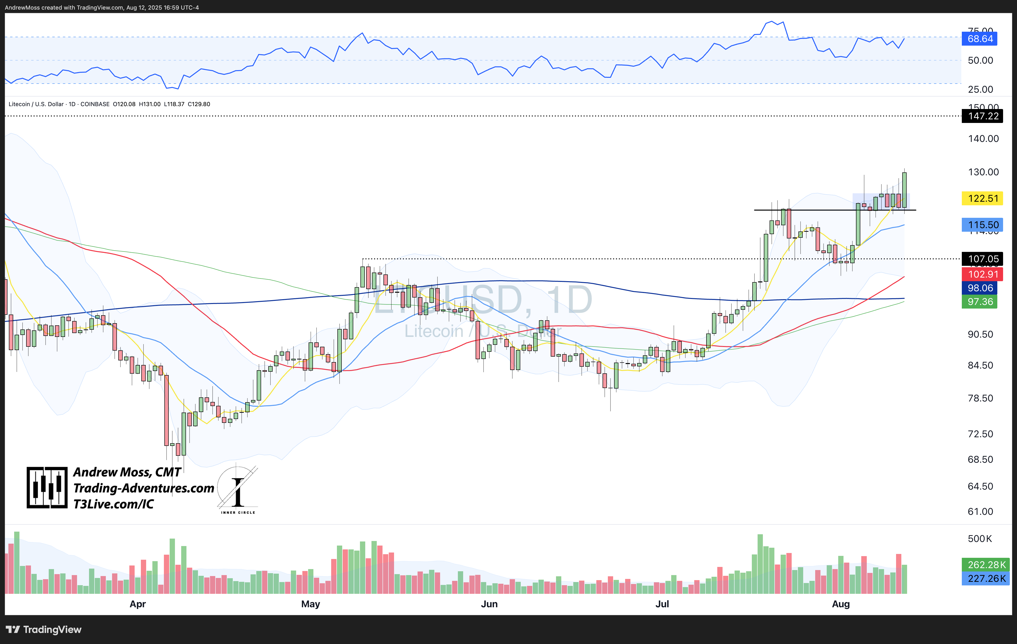 LTCUSD is rejoining the crypto craze, too, jumping out of the recent 9-day consolidation and up to the $130s. It has a pivot at $147.22 to reach for.