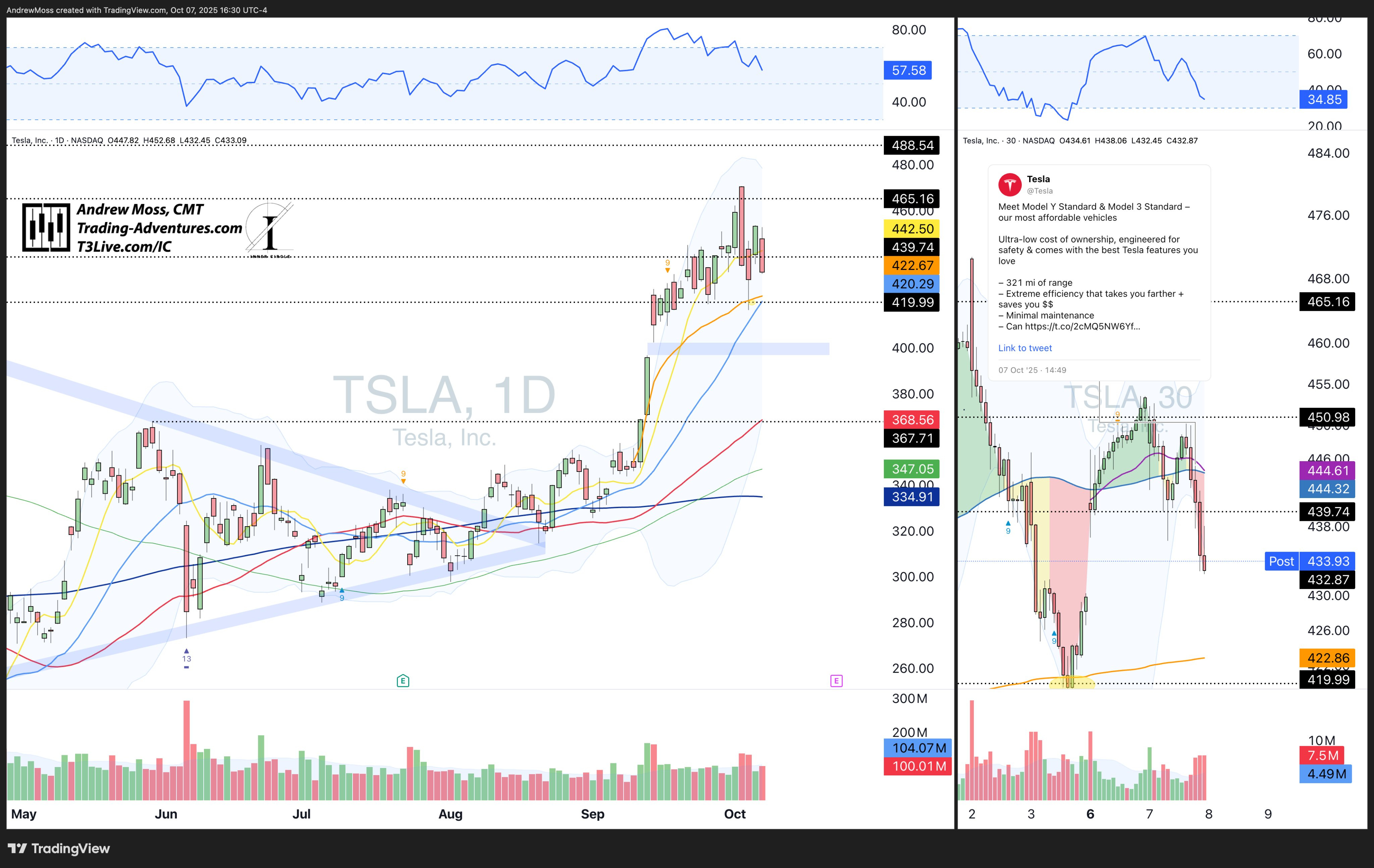Traded near 450 early and closed at 433 (-20 pts). The “affordable model” reveal didn’t impress; price action confirmed it.