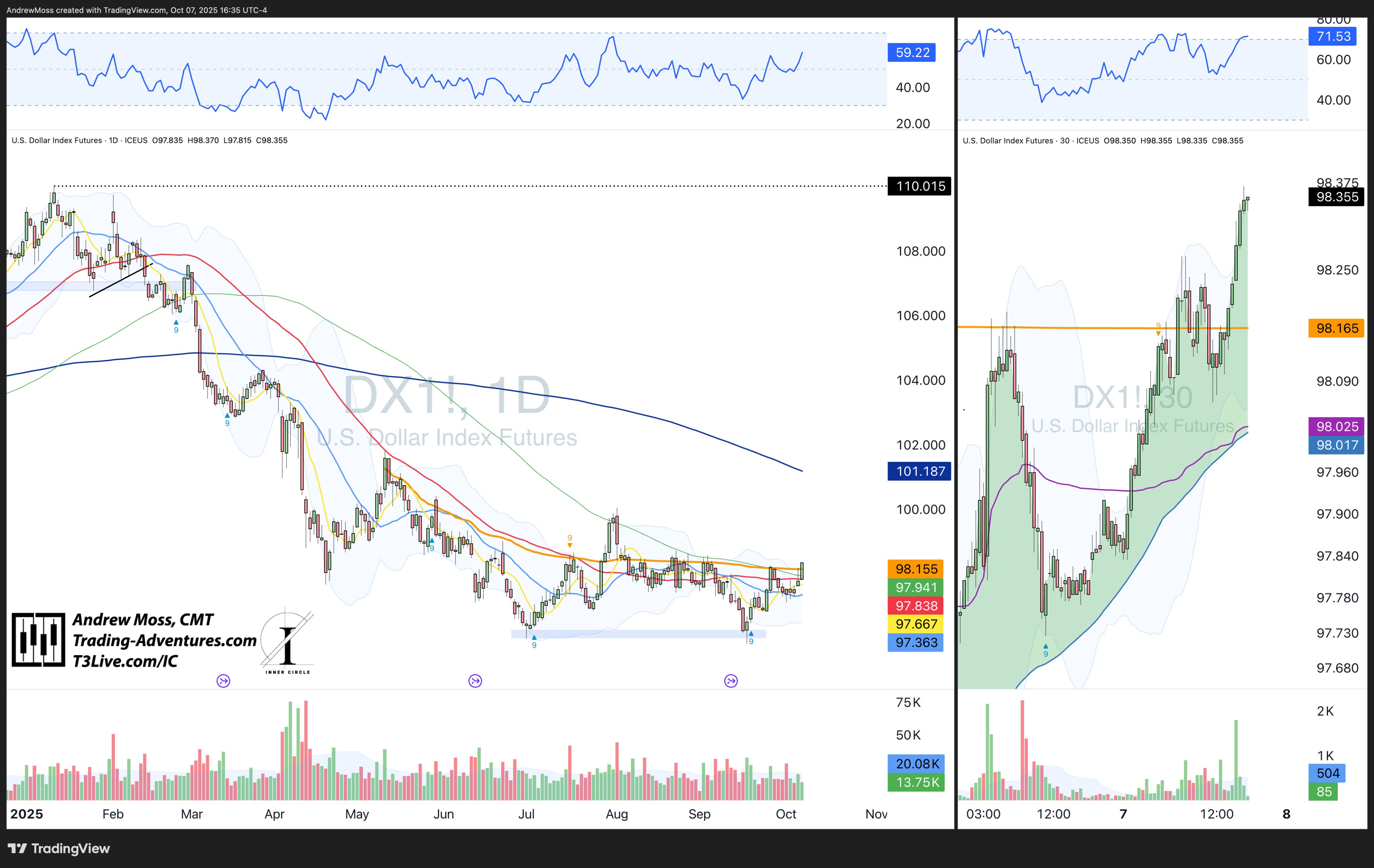 DXY / $DX1! extended its rally—now back above all key MAs except the 200-day and reclaimed the anchored VWAP from the May 12 pivot high. Dollar strength continues to pressure risk assets in the short term.