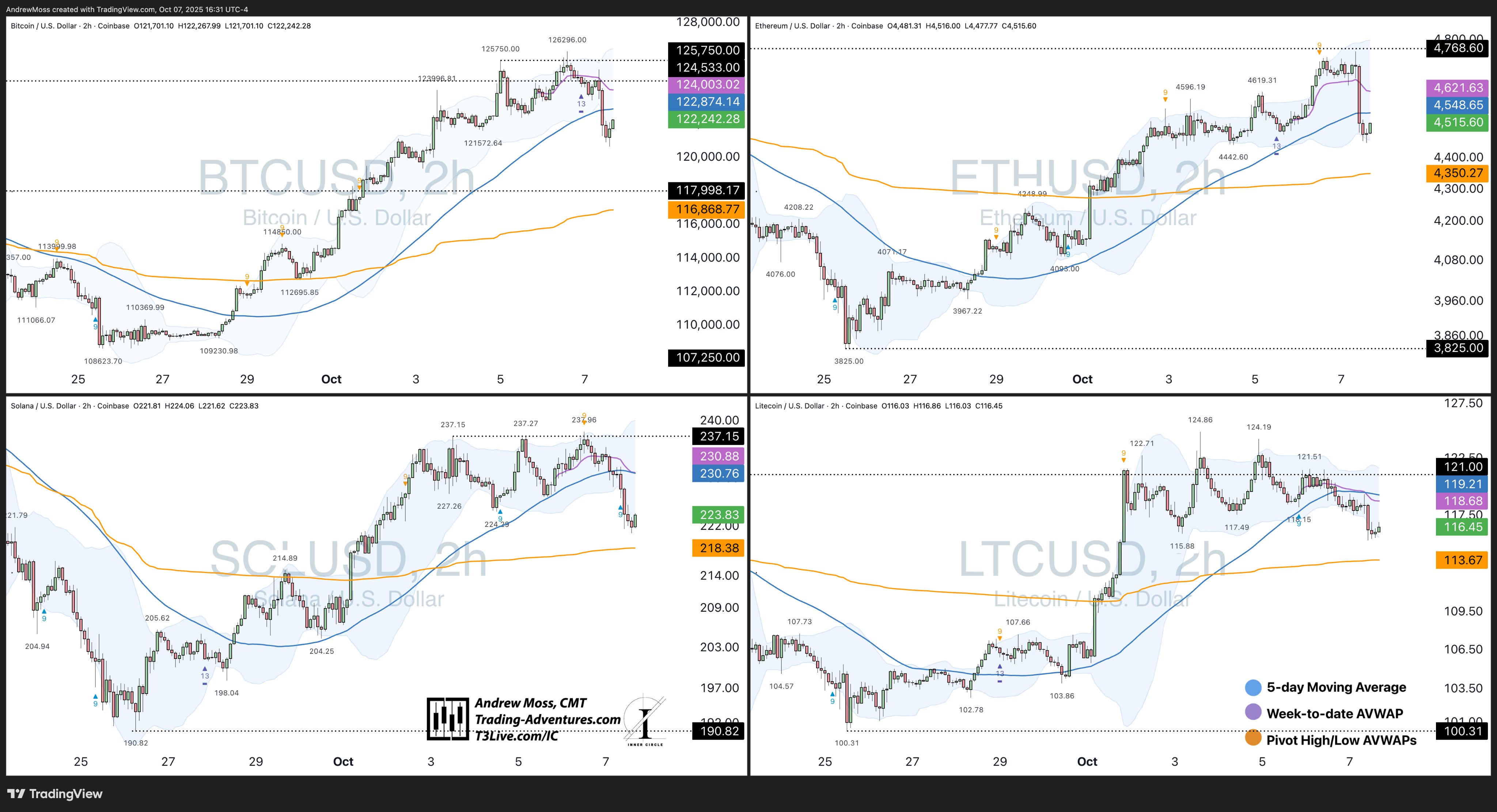 After Monday’s surge, majors cooled off: BTC -2%, ETH -3.9%, SOL -4%. Healthy pause; many still above key VWAP zones.