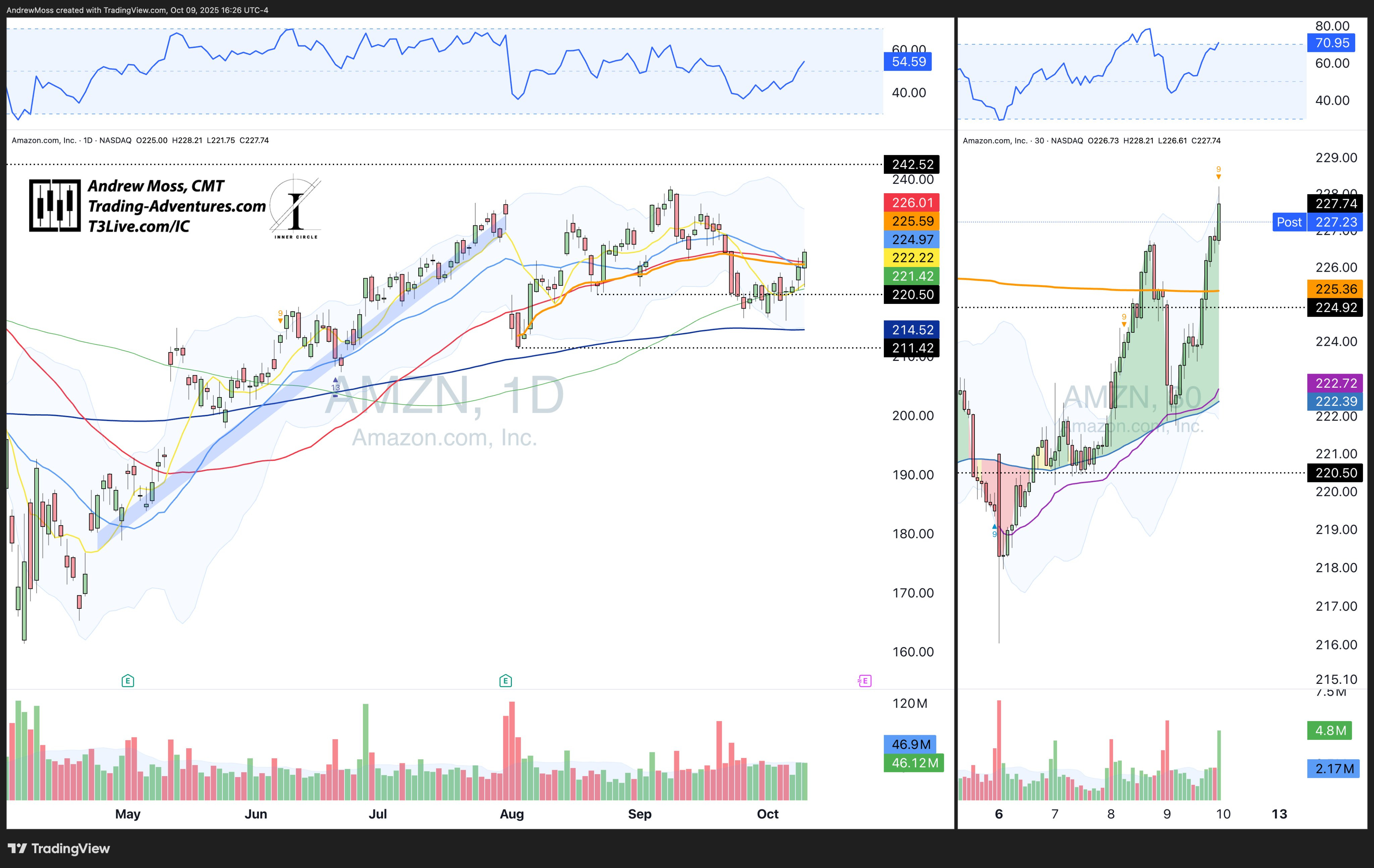 AMZN sold to the 221 zone (5-day/AVWAP) and ripped back to 227, closing over the 50-day—very constructive.