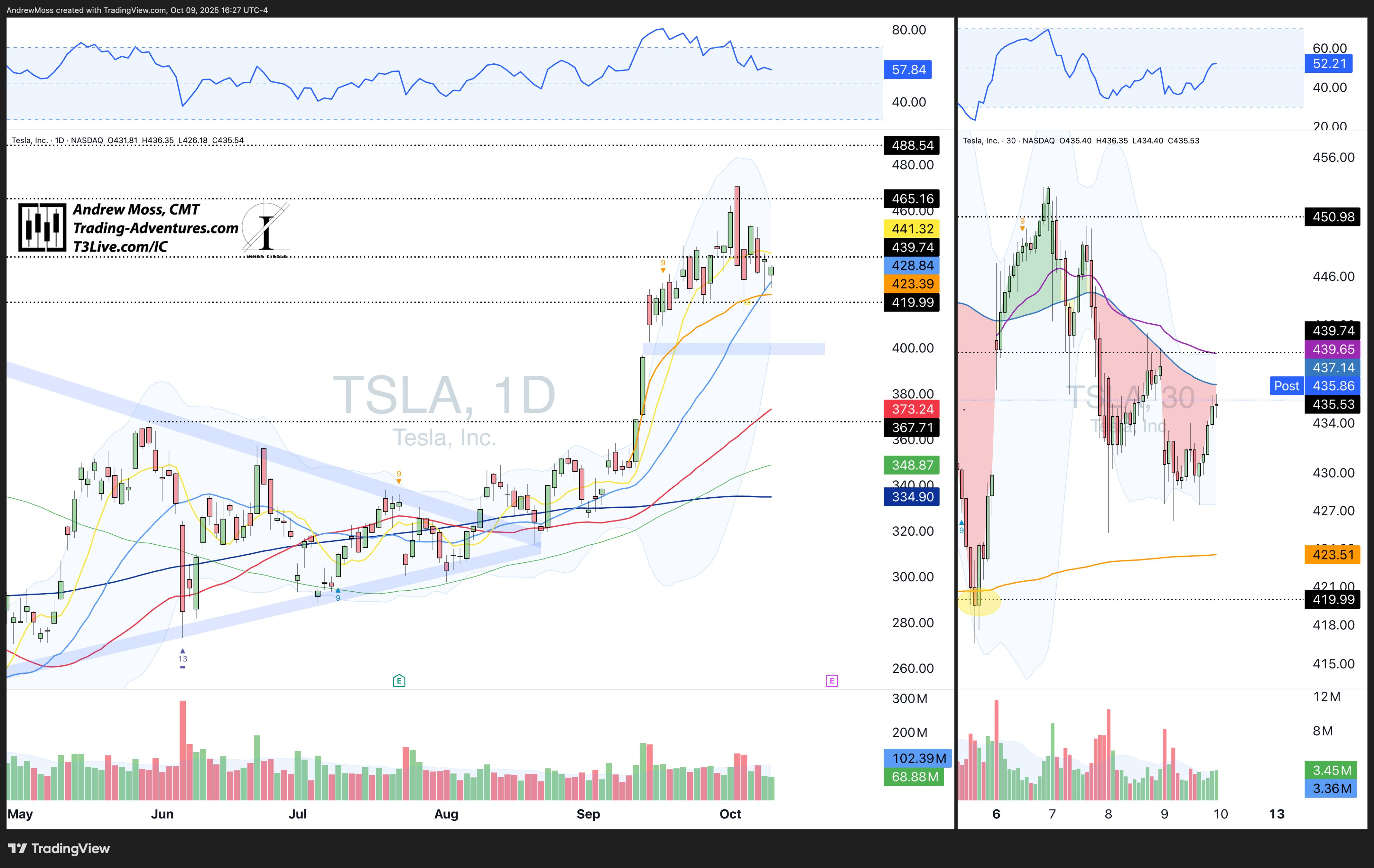 TSLA tested the 21-day early, rallied late. Watch for a move over 437–442 (5-day, 8-day, WTD AVWAP, and that 439.74 pivot) for confirmation.