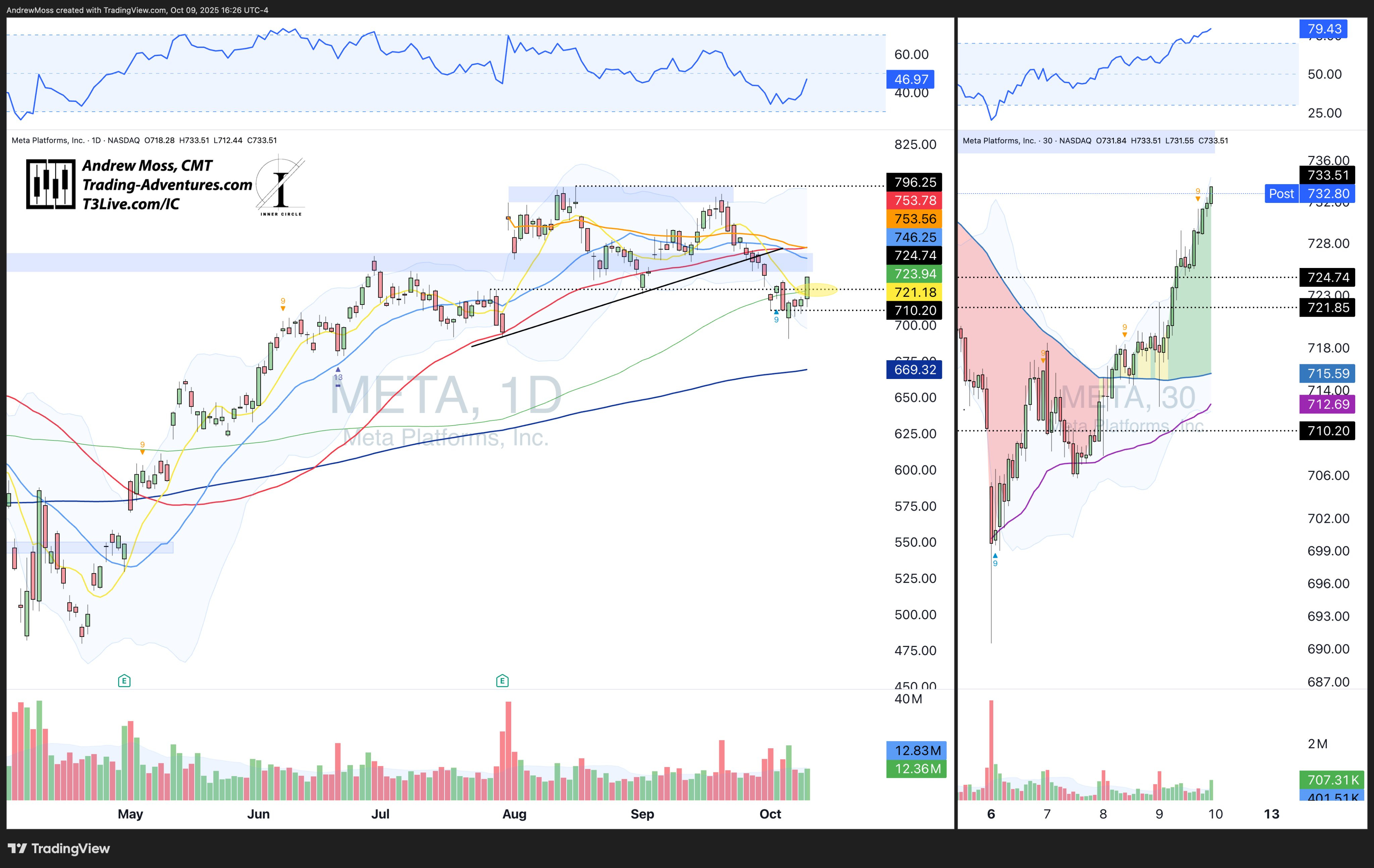 META showed standout strength—steady climb all session. Now above the 8-day, 100-day, and the 724.74 pivot. Next reference levels: ~746 (21-day) and ~753 (50-day + earnings AVWAP).