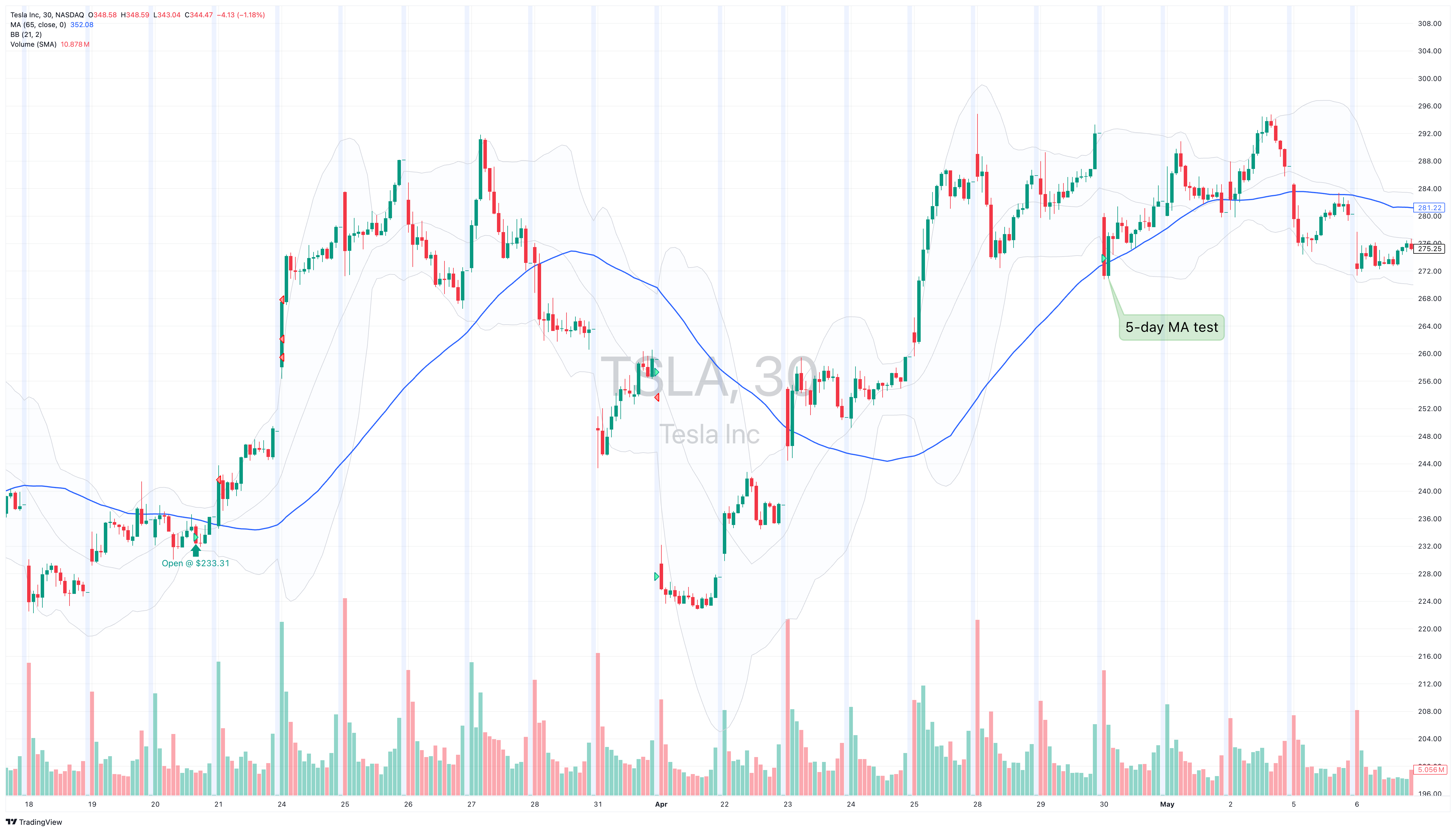TSLA tests horizontal support and moves to the 8-day MA. Structure compresses, volume fades.