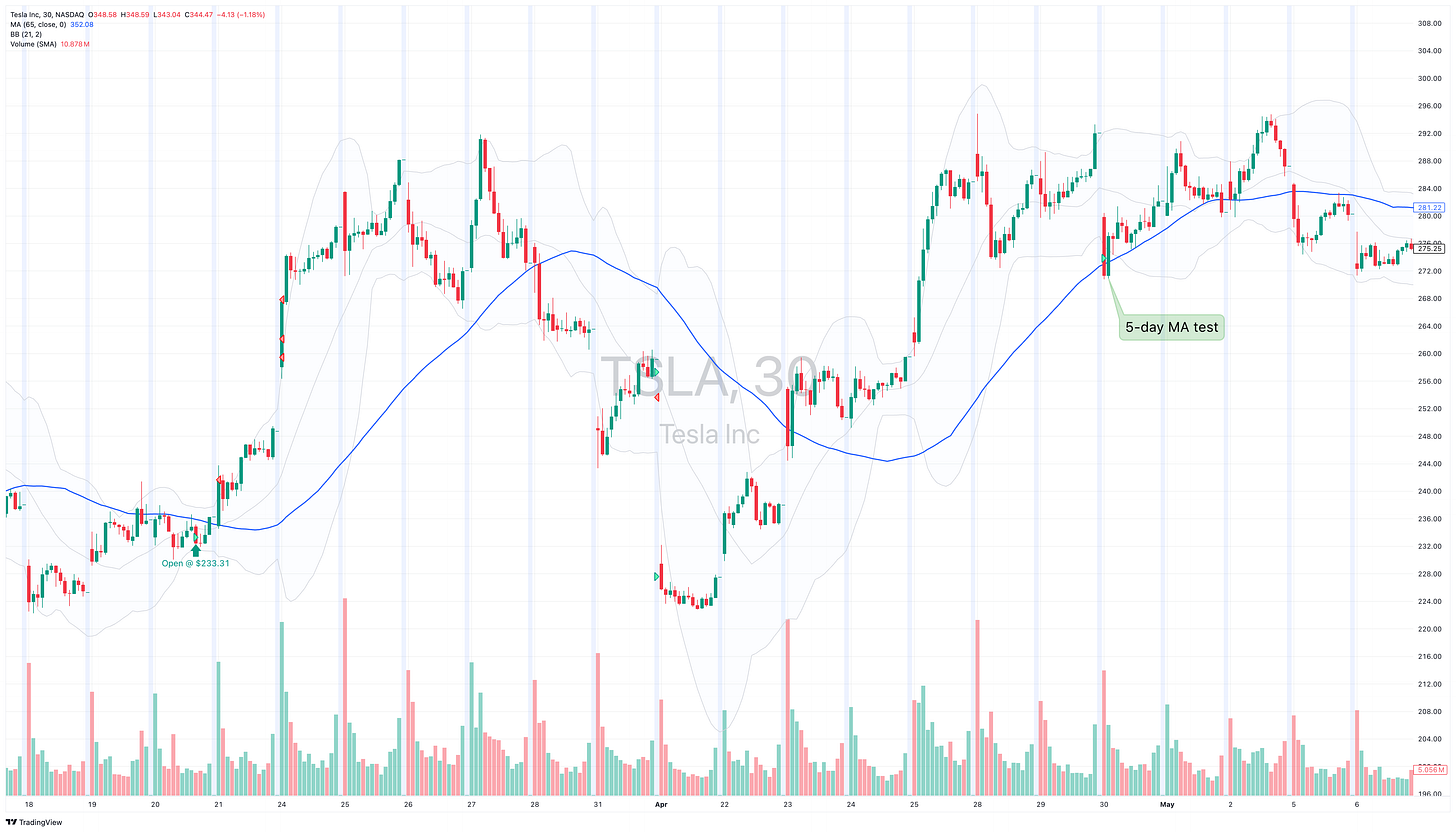 The position was initiated on March 20, near $233, as TSLA held the slight, recent gains and started pushing the 8-day MA higher. It was a starter entry, with defined risk just below the lows. Price had not reclaimed anything yet—but I didn’t need to wait for confirmation for a tier one sized entry.