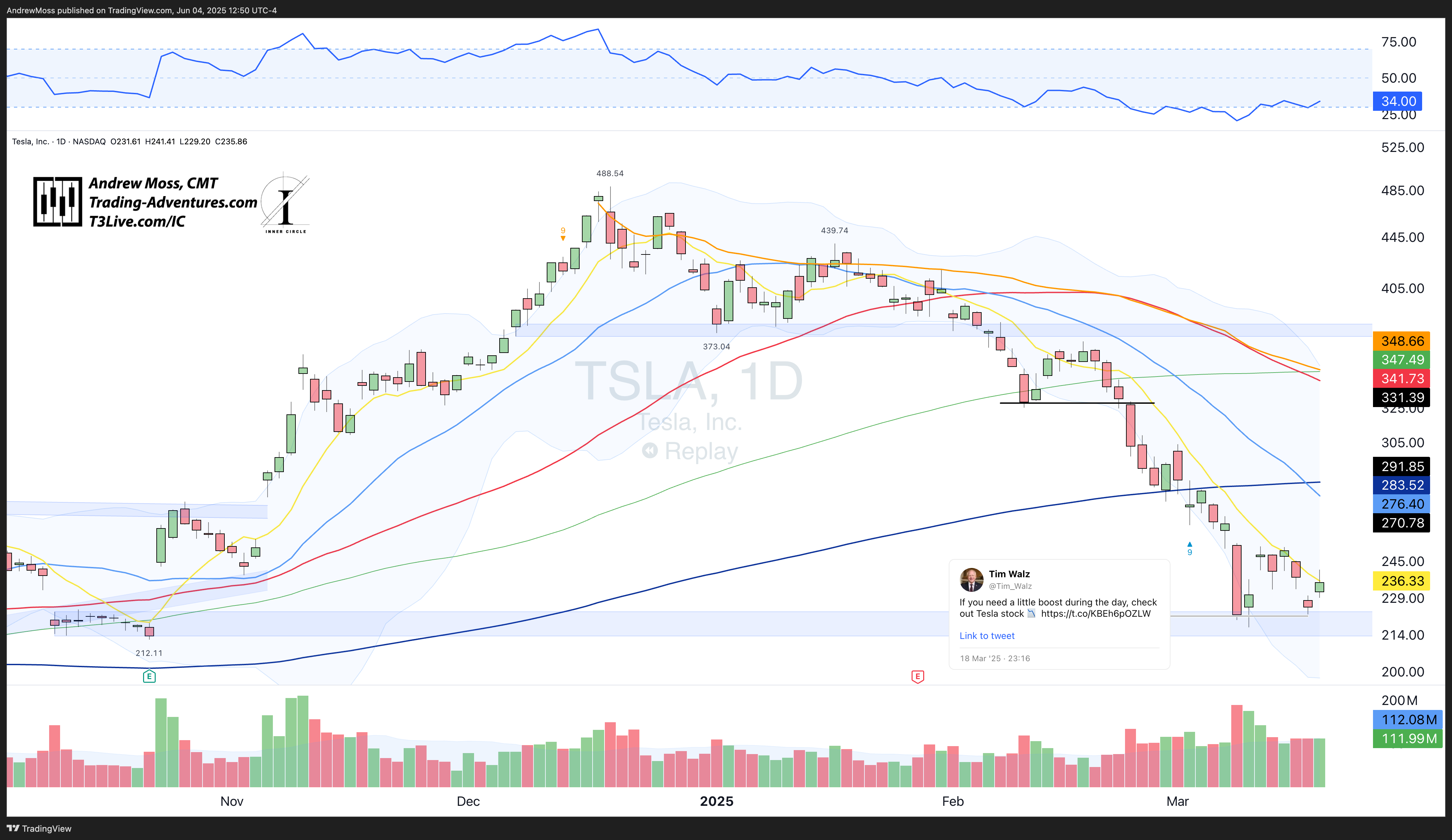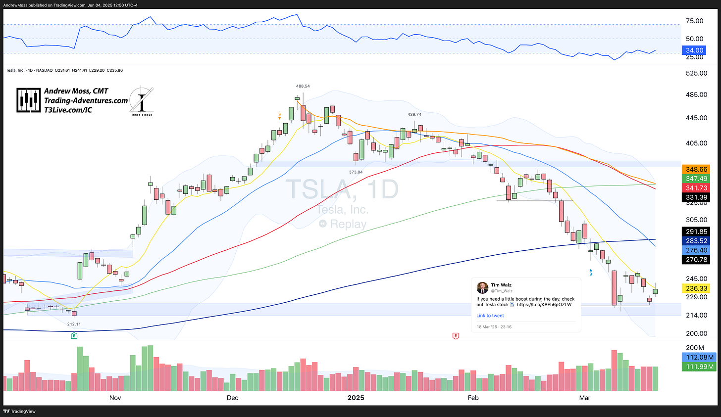 By mid-March 2025, TSLA had endured a prolonged downtrend by falling more than 50% from recent high prices, bounced slightly, and was back to retest a key horizontal support zone near $233, the same level that anchored the earlier March bounce.