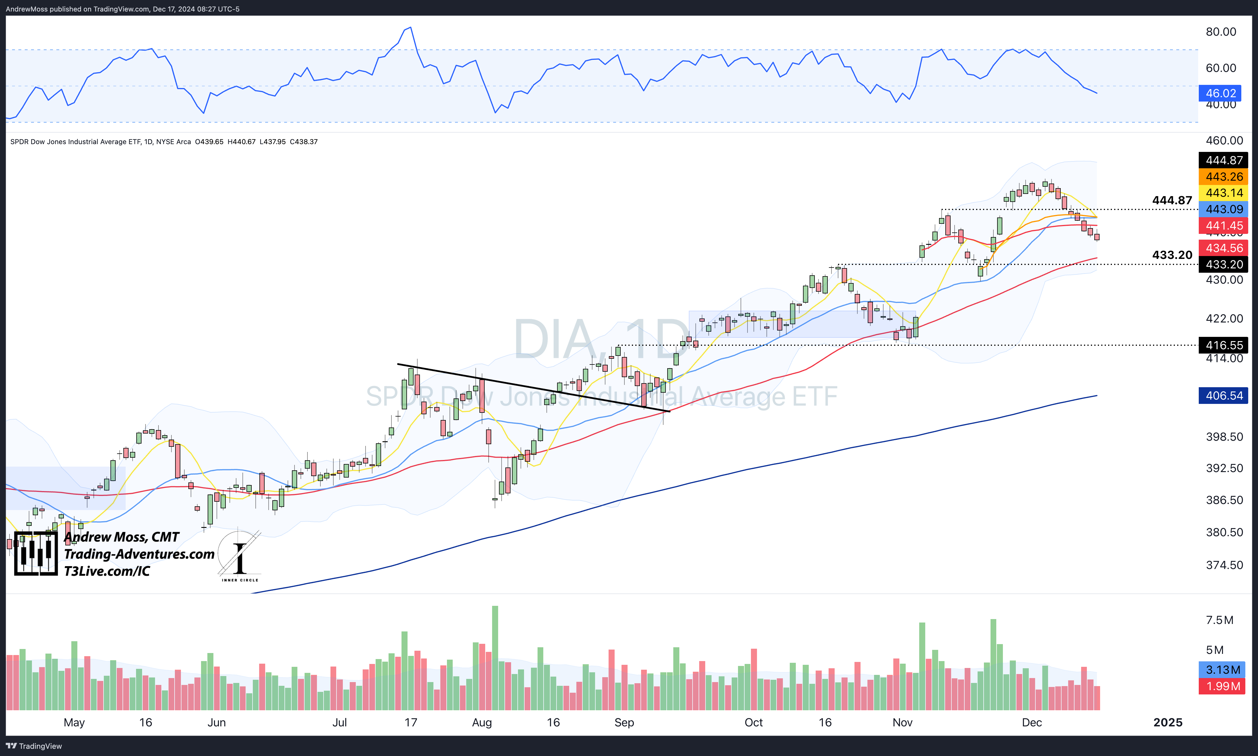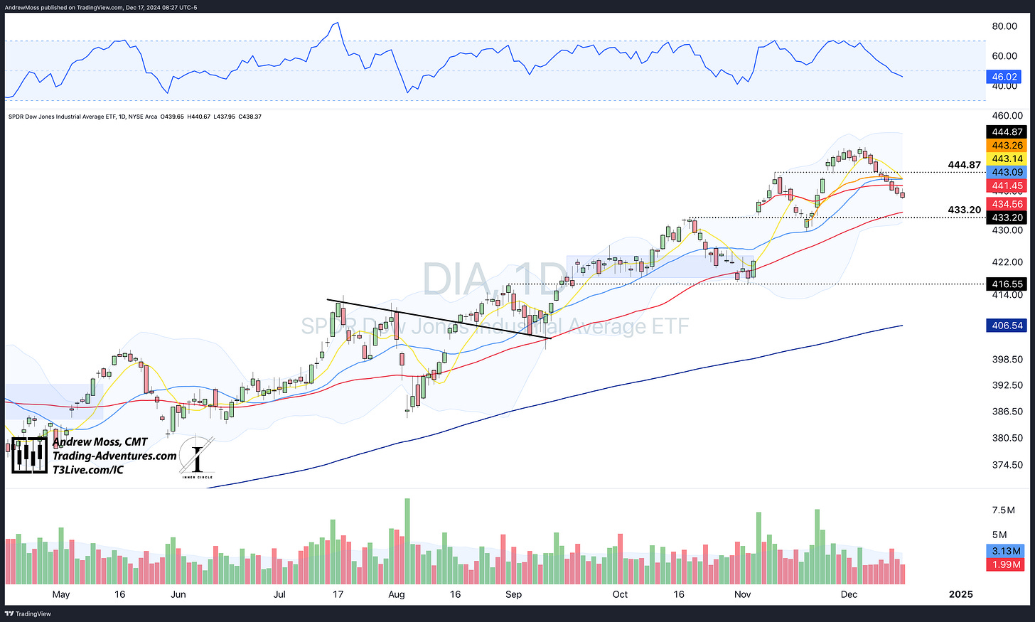 DIA has printed eight consecutive red candles and is lower again this morning. How long before it sees a bounce? There is a pivot level and the 50-day MA near $433-4 and $443-4 could be stiff resistance above.