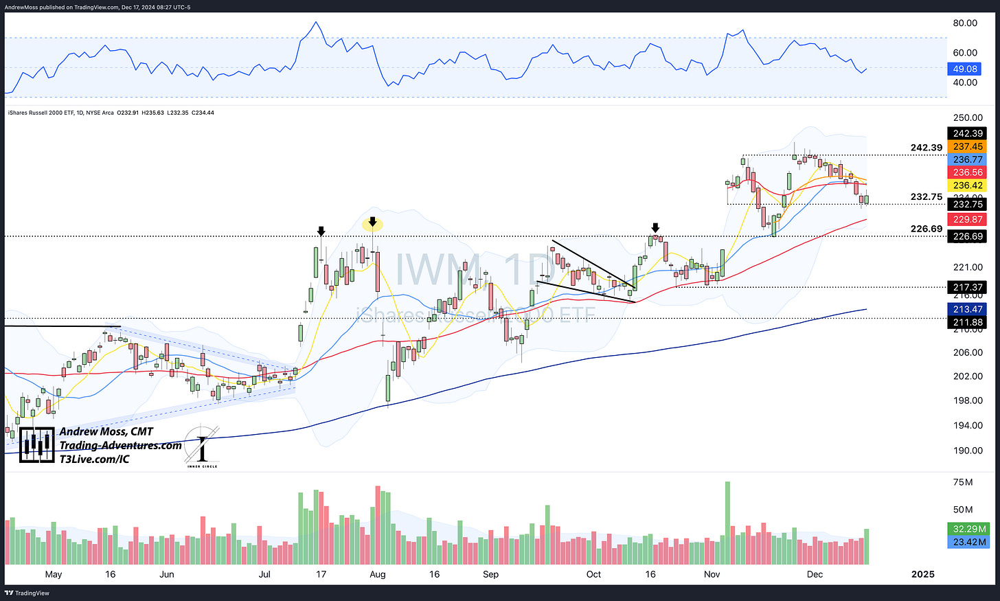 IWM has been suffering as bonds fall and rates rise. This morning, $232.75 is trying to hold again. The 50-day MA is the next spot below, near $230.
