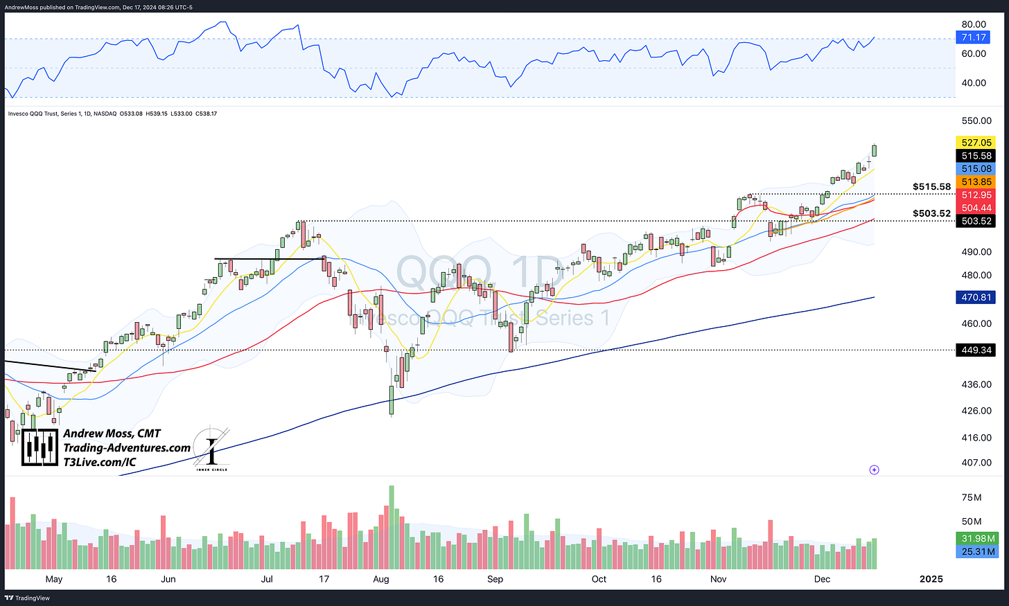 QQQ keeps rising steadily. There is no consolidation pattern here. RSI is reaching overbought status, and the price is extended above the 8-day MA. Some moderation could happen, and the $515 is still the first significant support area.