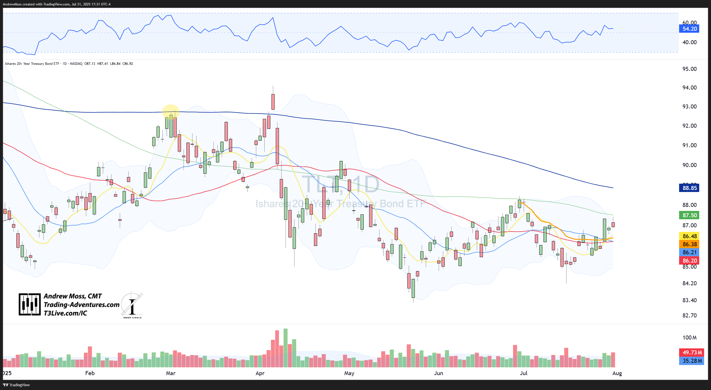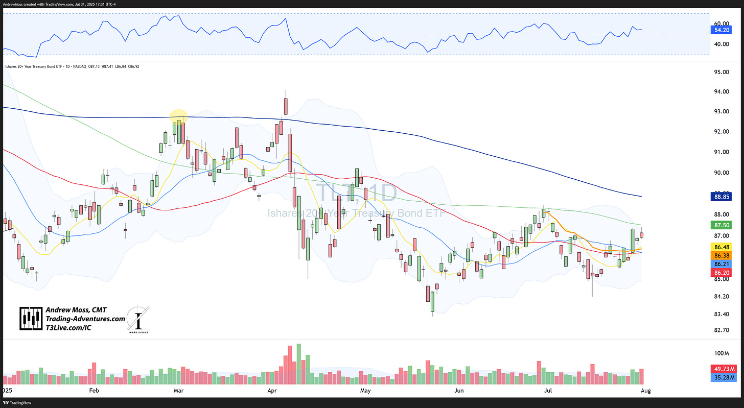 TLT tested its 100‑day SMA today before backing off — a sign that bonds are still trying to find their footing in this rate environment.